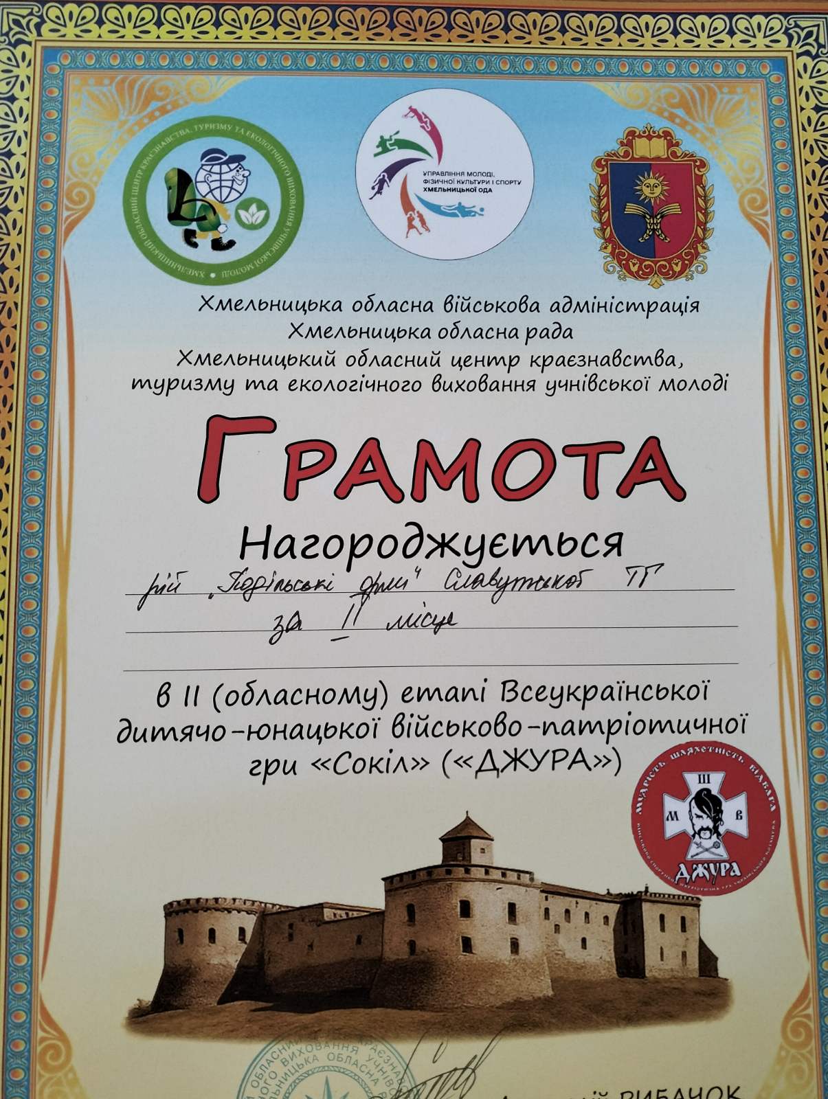 На Хмельниччині завершився ІІ (обласний) етап Всеукраїнської дитячо-юнацької військово-патріотичної гри «Сокіл» («Джура»), що проходив з 24 по 26 червня 2025 року в мальовничому селі Велика Левада Городоцької територіальної громади Хмельницької області. Ця знакова подія зібрала найталановитіших та найвідданіших юних патріотів з усієї області, об’єднаних спільною метою – демонстрацією своїх знань, умінь та любові до рідної землі. Гра «Джура» є надзвичайно важливим елементом патріотичного виховання молоді, формуючи у них лідерські якості, командний дух та глибоке розуміння історії та культури України, а також зміцнюючи військово-патріотичну підготовку. Славутську міську територіальну громаду з особливою гідністю представив рій «Подільські орли» Славутської гімназії №6 Славутської міської ради. Ця команда, демонструючи високу підготовку та непересічний ентузіазм, вразила журі та вболівальників своєю згуртованістю, непохитною силою духу та справжньою, щирою любов’ю до України. Серед 13 команд-учасників області, рій «Подільські орли» виборов почесне ІІ загальнокомандне місце, що є свідченням їхньої наполегливої праці та таланту. Ця перемога на обласному етапі гри «Джура» стала важливим досягненням для Славутської громади, підкреслюючи високий рівень підготовки місцевої молоді та вагомий внесок у патріотичне виховання. Учасники рою «Подільські орли» продемонстрували вражаючі результати в кількох ключових конкурсах, здобувши найвищі нагороди: 🔹 І місце у конкурсі «Ватра», де журі оцінювало знання історії козацтва та вміння розпалювати вогнище, демонструючи справжній дух козацької громади. 🔹 І місце в інтелектуальній грі «Відун», що вимагала глибоких знань з історії України. Юні джури з «Подільських орлів» показали блискучі результати, підтвердивши свою обізнаність у минулому рідної країни. 🔹 І місце у конкурсі «Бівак», який оцінював навички облаштування табору та виживання в польових умовах, що є важливим аспектом військово-патріотичної підготовки. Окрім цього, команда виборола ІІІ місце у конкурсі «Смуга перешкод», де перевірялися фізична витривалість, спритність та злагодженість дій, що є ключовим у військово-патріотичній грі. Також, рій «Подільські орли» отримав високу оцінку суддів за бездоганну стройову підготовку у конкурсі «Впоряд», хоча цей конкурс і був поза заліком, він яскраво свідчить про їхню дисципліну та організованість. Юні патріоти знову довели, що Славутська гімназія №6 виховує справжніх переможців. Від щирого серця вітаємо юних джур, рій «Подільські орли», з цією блискучою перемогою! Ваша наполегливість, відвага, залізна дисципліна та безмежна любов до рідної землі роблять вас справжньою гордістю Славути та всієї Хмельницької області. Бажаємо вам незліченних нових звершень, яскравих перемог на майбутніх етапах військово-патріотичної гри «Сокіл» («Джура») та щасливої долі, сповненої успіхів та здобутків. Особлива подяка висловлюється виховникам рою – Крістіні Вакульчук та її заступнику Петру Сахнюку – за їхній невтомний професіоналізм, безмежну відданість справі та мудре наставництво. Саме завдяки вашій турботі, безцінному досвіду та підтримці юні джури змогли розкрити свій потенціал, впевнено подолати всі випробування та досягти цієї вражаючої перемоги на обласному рівні. Ваш