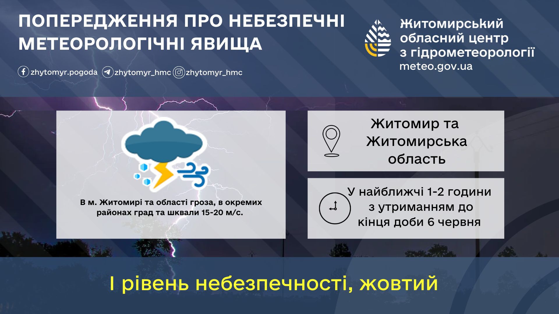 Увага! Оголошено попередження про небезпечне метеорологічне явище І рівня небезпечності (НМЯ І) для міста Житомира та Житомирської області. В найближчі 1-2 години, яке триватиме до кінця доби 6 червня, очікуються грози ⚡. В окремих районах можливий град та шквали вітру 💨 силою 15-20 м/с. Рівень небезпечності – І, жовтий 🟡.