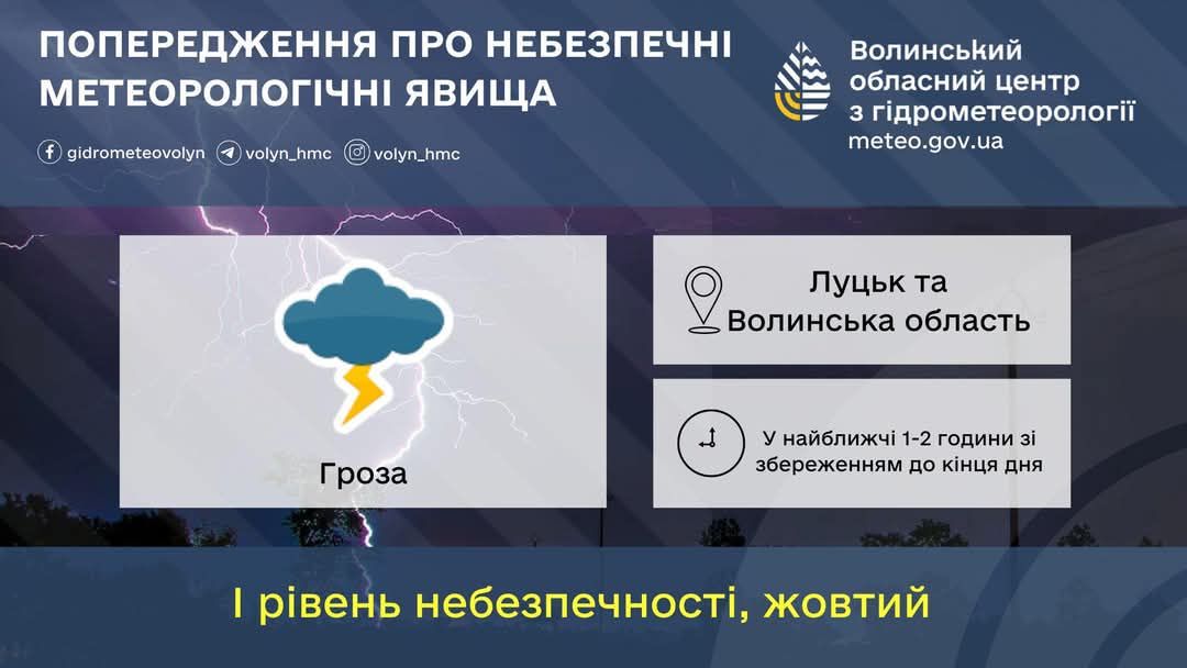 Жителів Волинської області попереджають про небезпечні метеорологічні явища! Протягом найближчих 1-2 годин, і до кінця доби 31 травня, на території області очікується гроза. Будьте обережні та уважні до навколишнього середовища.