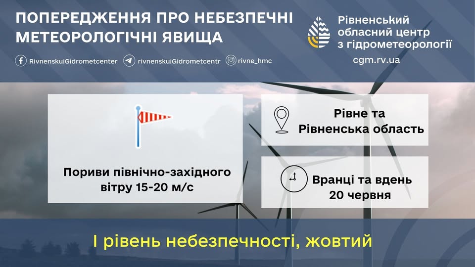 📣 Попередження про небезпечні метеорологічні явища по Рівненщині Вранці та вдень 2️⃣0️⃣ червня по Рівненській області очікуються пориви північно-західного вітру 15-20 м/с ! 1-й рівень небезпечності – жовтий🟡