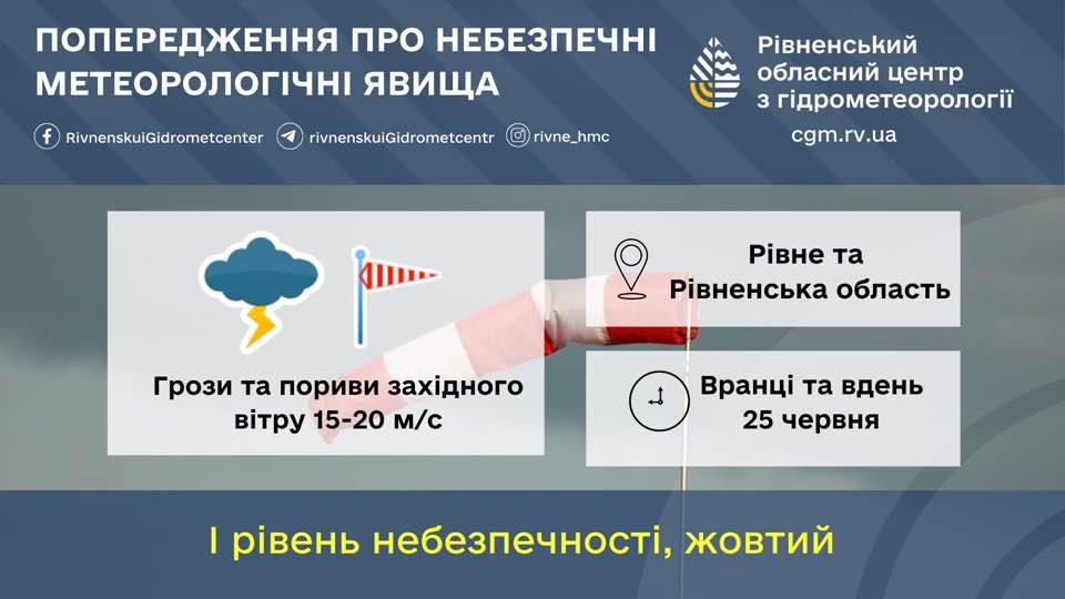 Вранці та вдень 2️⃣5️⃣ червня по м.Рівне та області очікуються грози та пориви західного вітру 15-20 м/с!