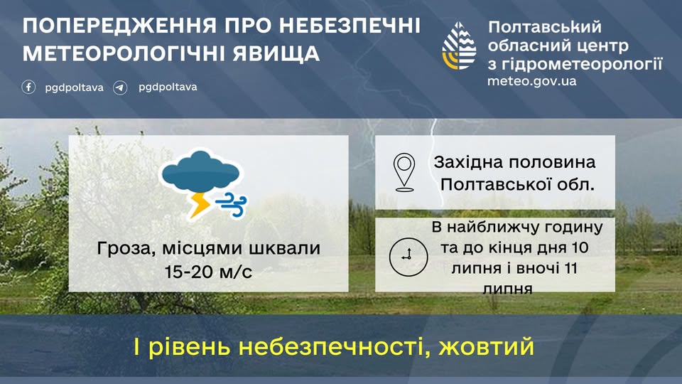 Шановні мешканці Полтавщини! За інформацією Полтавського обласного центру з гідрометеорології, найближчим часом та до кінця дня 10 липня, а також протягом ночі 11 липня 2025 року, в західній частині області очікуються значні погіршення погодних умов. Прогнозуються грози, подекуди сильні, що можуть супроводжуватися шквалами вітру зі швидкістю 15-20 метрів на секунду.Ці метеорологічні явища відповідають першому рівню небезпечності – жовтому. Це означає, що погодні умови є потенційно небезпечними та можуть спричинити певні незручності або навіть локальні пошкодження. Грози, відомі своїми електричними розрядами, можуть становити загрозу для людей і майна, тому важливо дотримуватися підвищених заходів безпеки. Сильні шквали, у свою чергу, здатні ламати гілки дерев, пошкоджувати легкі конструкції та створювати небезпеку на дорогах.Мешканцям Полтавщини, особливо тим, хто проживає або планує пересуватися західними районами області, настійно рекомендується бути максимально обережними. Під час грози уникайте перебування на відкритих просторах, поблизу металевих конструкцій та високих дерев. Рекомендується вимкнути електроприлади та не користуватися телефоном, якщо це можливо. Якщо ви перебуваєте на вулиці, шукайте укриття в найближчому приміщенні або автомобілі.Водії повинні бути особливо уважними на дорогах. Сильний дощ під час грози значно погіршує видимість, а шквалистий вітер може ускладнювати керування транспортним засобом. Знизьте швидкість, дотримуйтесь безпечної дистанції та уникайте різких маневрів. Пішоходам також слід бути обачними, особливо при перетині вулиць та під час руху поблизу високих будівель, де можуть падати предмети, зірвані вітром.Ці прогнози для Полтавщини є важливим попередженням для всіх громадян. Слідкуйте за офіційними повідомленнями щодо погодних умов та будьте готові до можливих змін. Завчасна підготовка допоможе мінімізувати ризики та забезпечити вашу безпеку. Пам’ятайте, що ваша безпека та безпека ваших близьких – найголовніше. Сподіваємося, що, незважаючи на попередження, погодні умови не спричинять значних проблем для Полтавщини.Будьте уважні та бережіть себе!