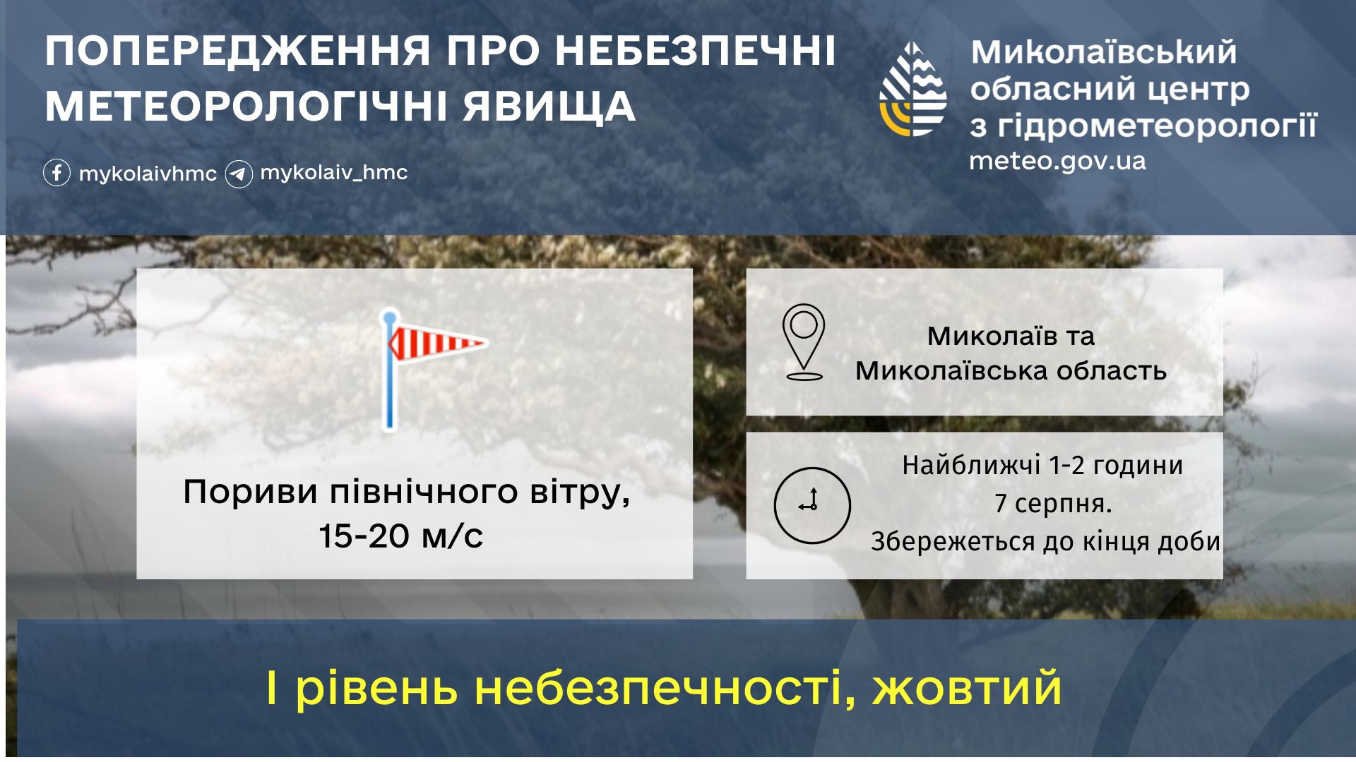 В найближчі 1 – 2 години 7 серпня 2025 року по Миколаївській області та м.Миколаїв очікується посилення північного вітру, 15-20 м/с.