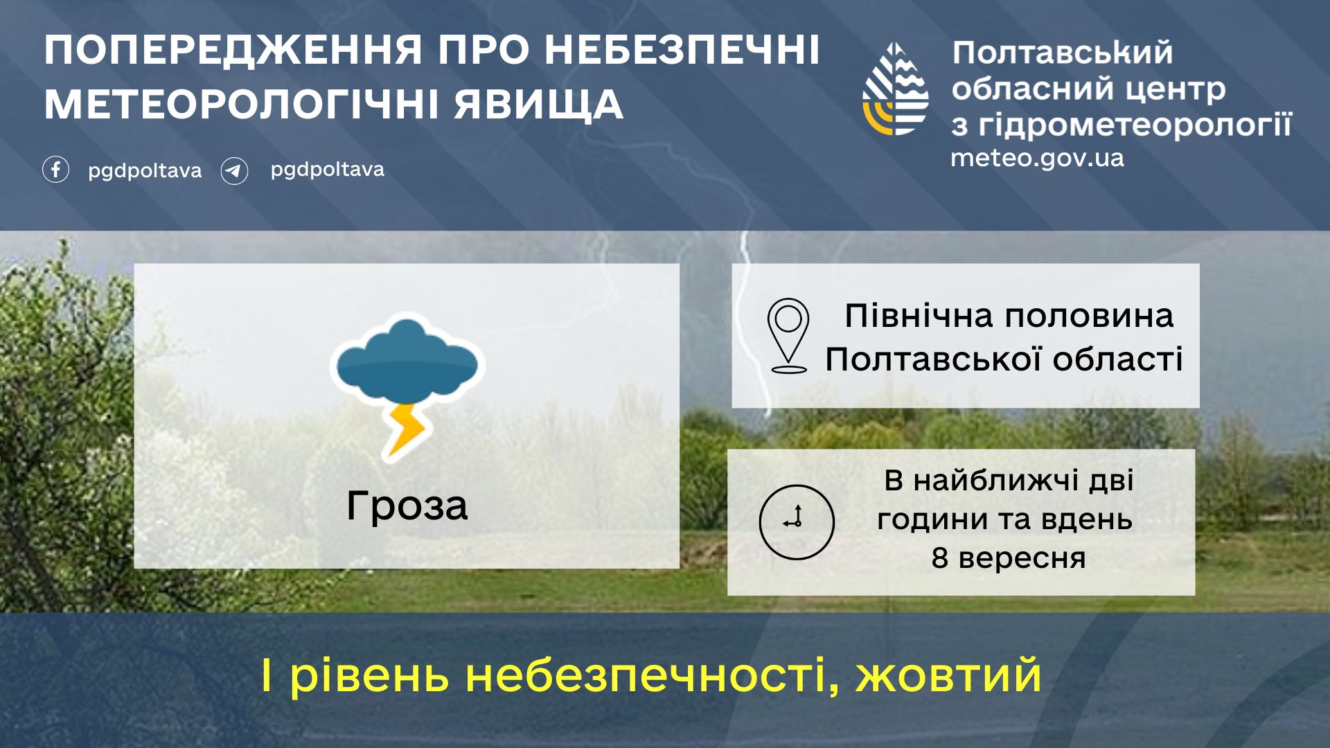 На території Полтавської області очікуються несприятливі погодні умови. Зокрема, протягом найближчих двох годин та до кінця дня 8 вересня, у північній частині регіону прогнозуються сильні грози. Синоптики оголосили