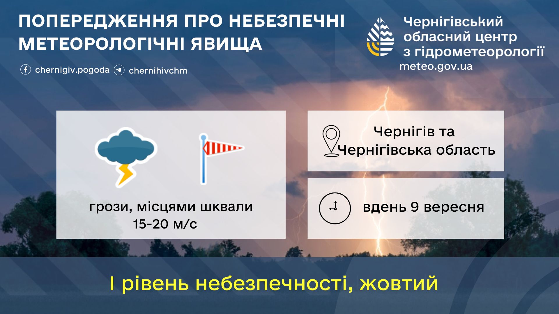 За прогнозами Чернігівського обласного центру з гідрометеорології, вдень 9 вересня на території міста Чернігова та Чернігівської області прогнозуються сильні грози. Місцями очікуються пориви вітру, що досягатимуть шквальної сили 15-20 м/с. Це відповідає першому, жовтому, рівню небезпечності.