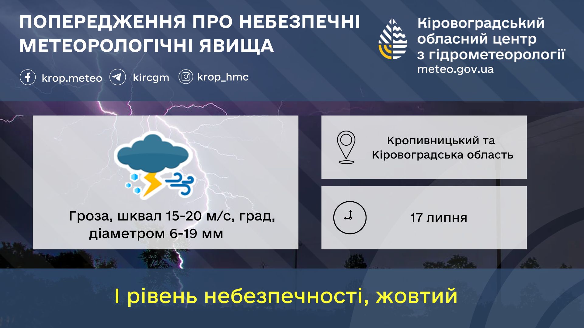 Протягом доби 17 липня очікується гроза, вдень в окремих районах град, діаметром 6-19 мм, шквал 15-20 м/с.