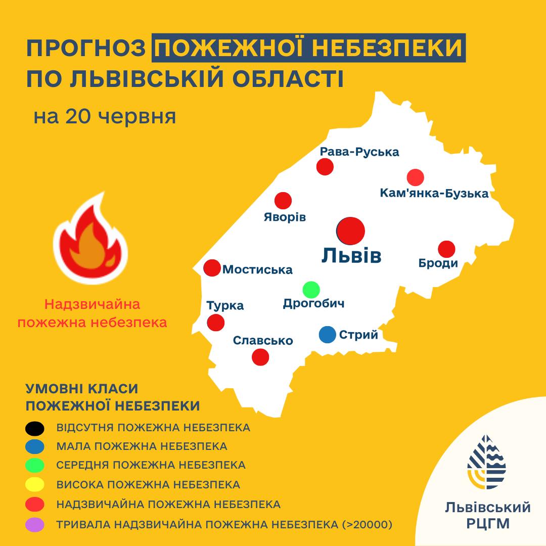 Мешканців Львівської області та міста Львова попереджають про надзвичайно високий рівень пожежної небезпеки, 5-й клас, який очікується 20 червня. Погодні умови сприятимуть значному ризику виникнення та швидкому поширенню пожеж в екосистемах. Будьте особливо обережні з відкритим вогнем!
