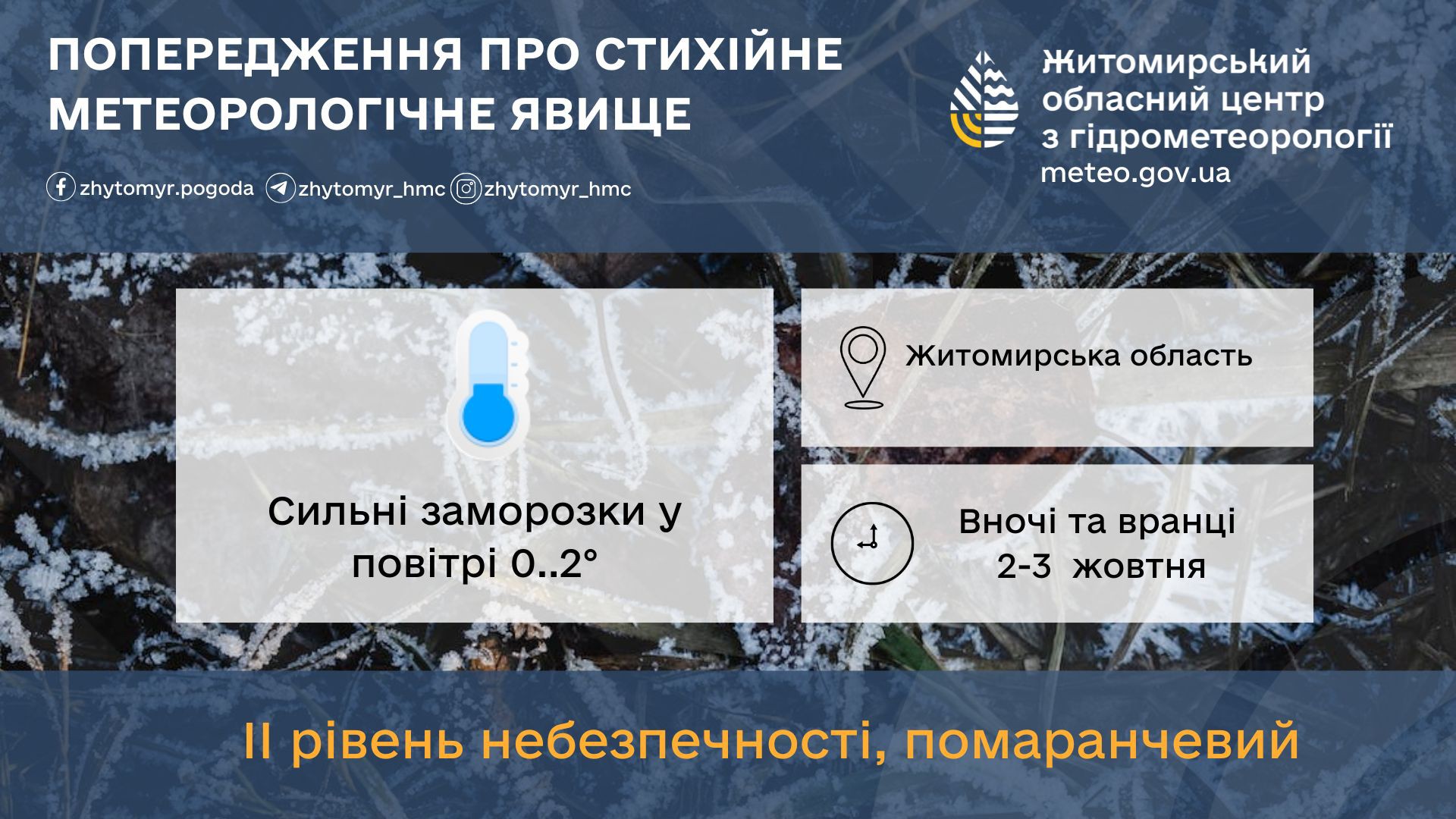 Увага, мешканці Житомирщини! Небезпечні погодні умови наближаються. Вночі та вранці 2 жовтня, а також протягом 3 жовтня, по всій території області очікуються сильні заморозки у повітрі. Температура повітря може сягати від 0 до -2 градусів за Цельсієм. Ці ‼️погодні умови відповідають ІІ рівню небезпечності, який класифікується як помаранчевий.
