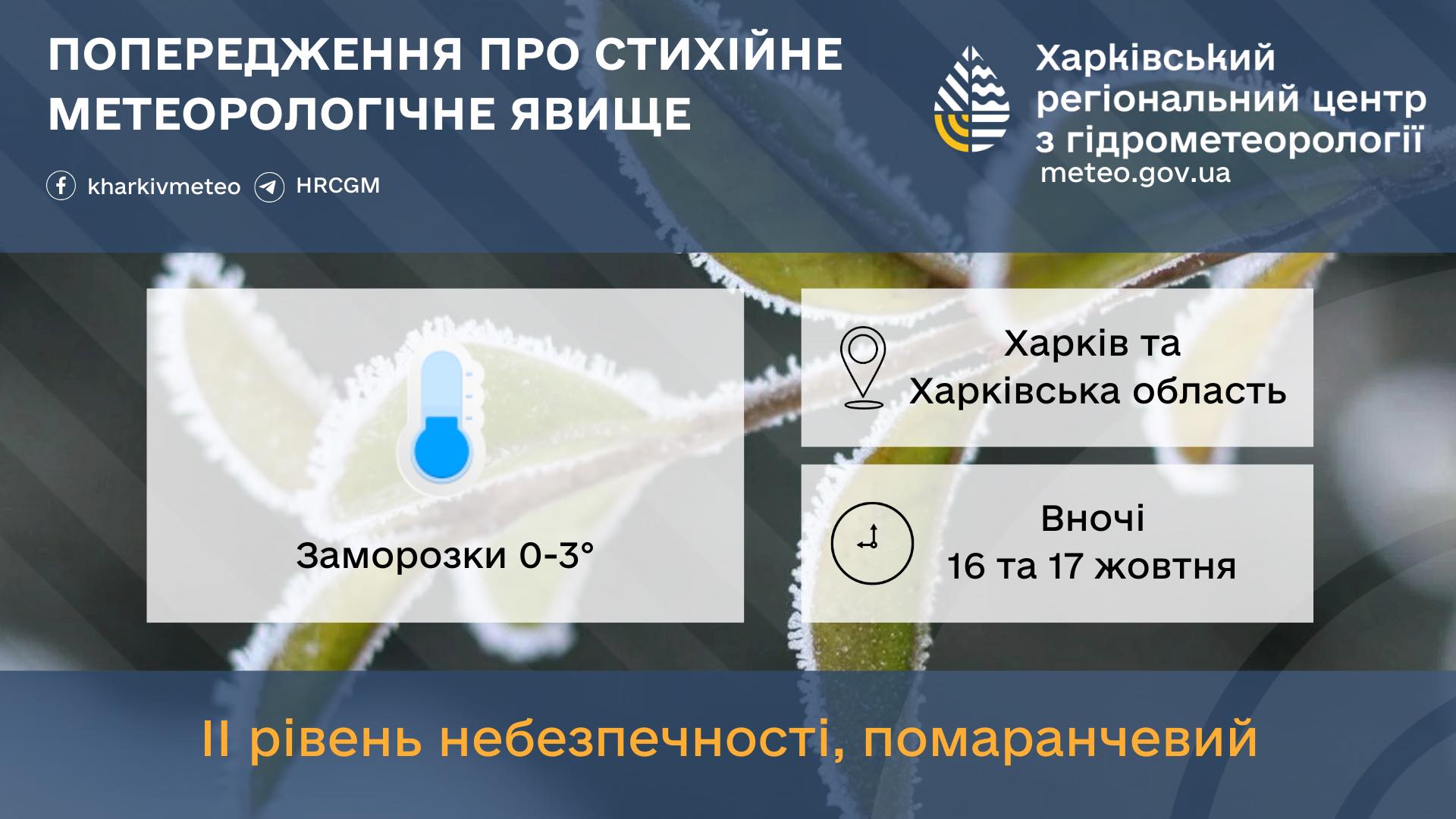 Увага, мешканці міста та області! Гідрометцентр оголошує попередження про стихійні метеорологічні явища, які очікуються 16 та 17 жовтня на території Харківщини. Вночі у ці дні прогнозуються заморозки, температура повітря знизиться до 0 – 3°C.