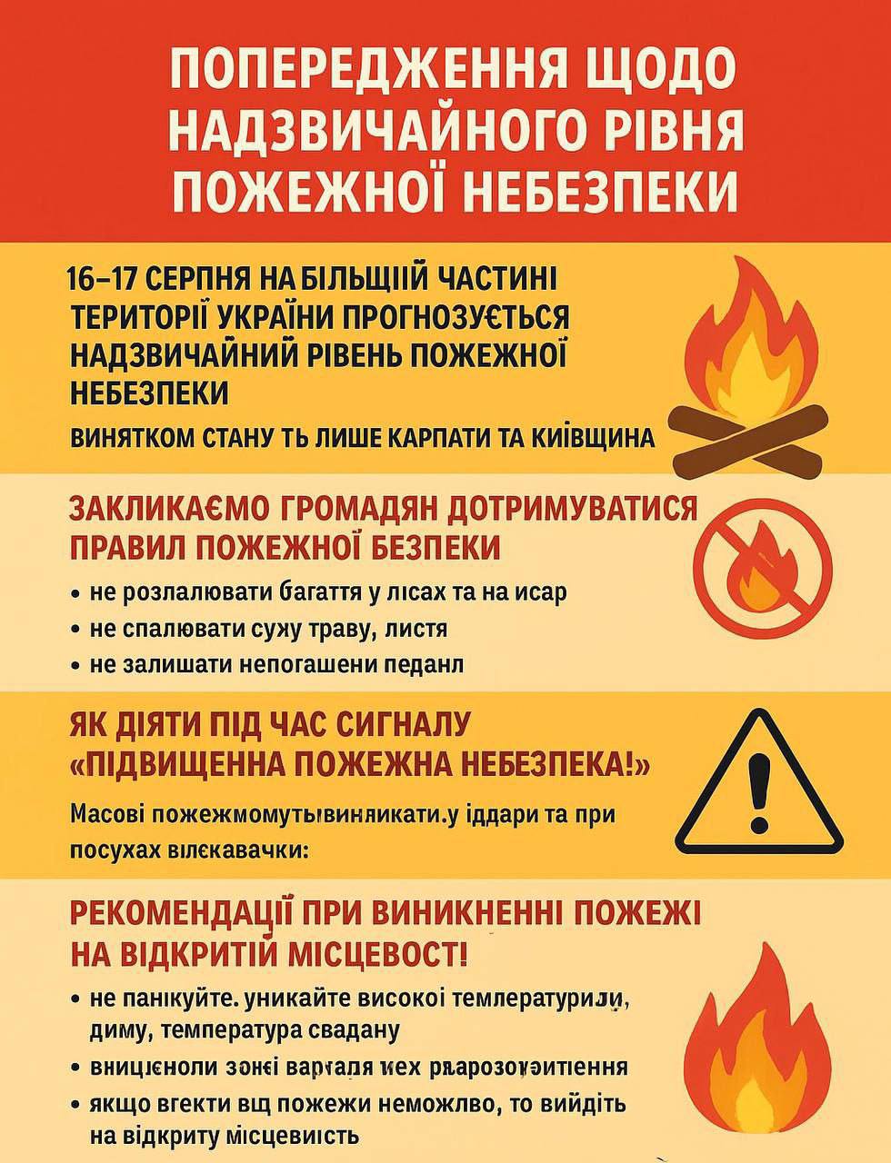 16–17 серпня більшість території України опиниться під загрозою надзвичайно високого рівня пожежної небезпеки. За прогнозами синоптиків, виняток становитимуть лише Карпати та Київщина. У зв’язку з цим, громадяни мають суворо дотримуватися правил пожежної безпеки, щоб уникнути масштабних загорянь. Не розпалюйте багаття у лісах та на відкритих ділянках, не спалюйте суху траву, листя чи сміття, а також не залишайте недопалки та сірники. Пам’ятайте, що порушення цих правил у спекотну та суху погоду може призвести до катастрофічних наслідків, адже вогонь поширюється блискавично. У разі будь-якого займання, негайно телефонуйте 101.