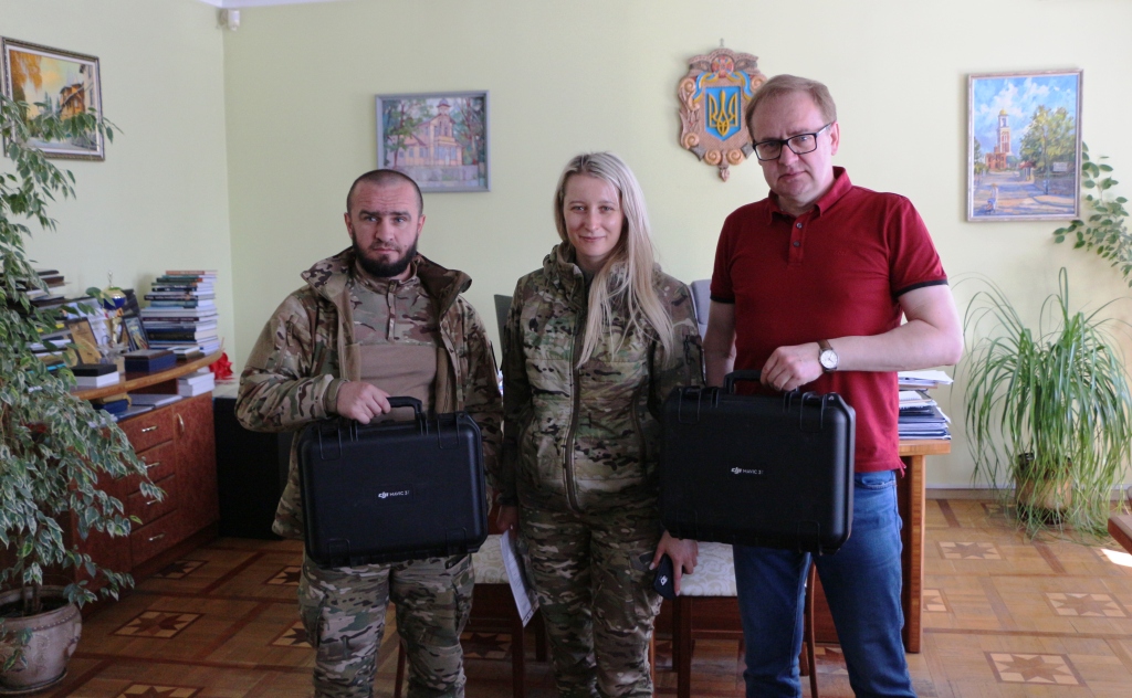 На фото: передача 2 БПЛА DJI Mavic 3T з тепловізійною камерою для 67 ОМБр в травні 2025 року.