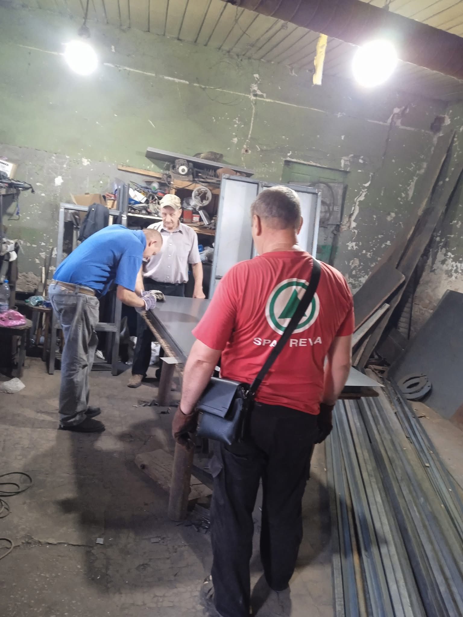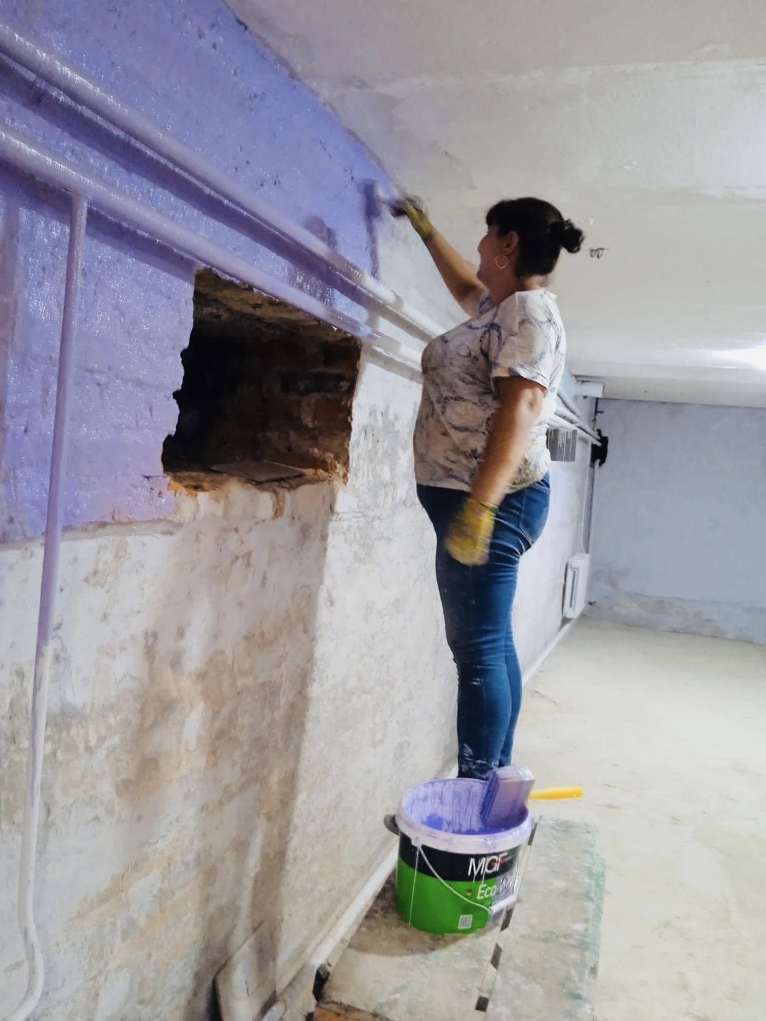 🔸 У протирадіаційному укритті, яке наразі облаштовується, будівельники побілили стіни у світлий бузковий колір. Паралельно зварювальники виготовляють та монтують чотири металеві двері. Усе – задля безпеки мешканців у разі небезпеки.