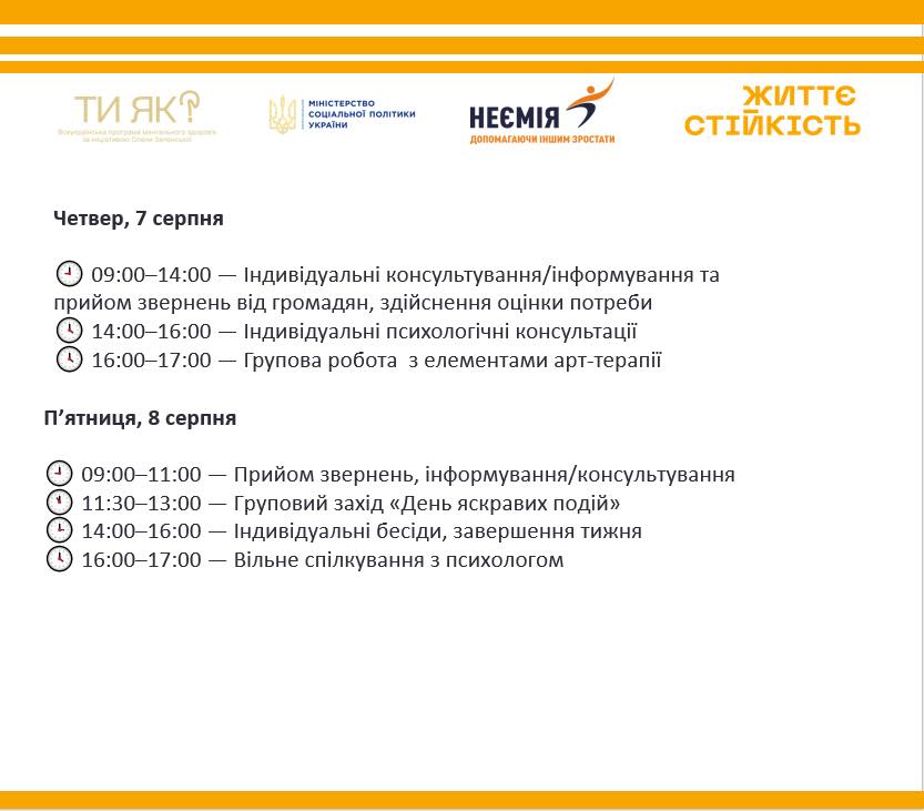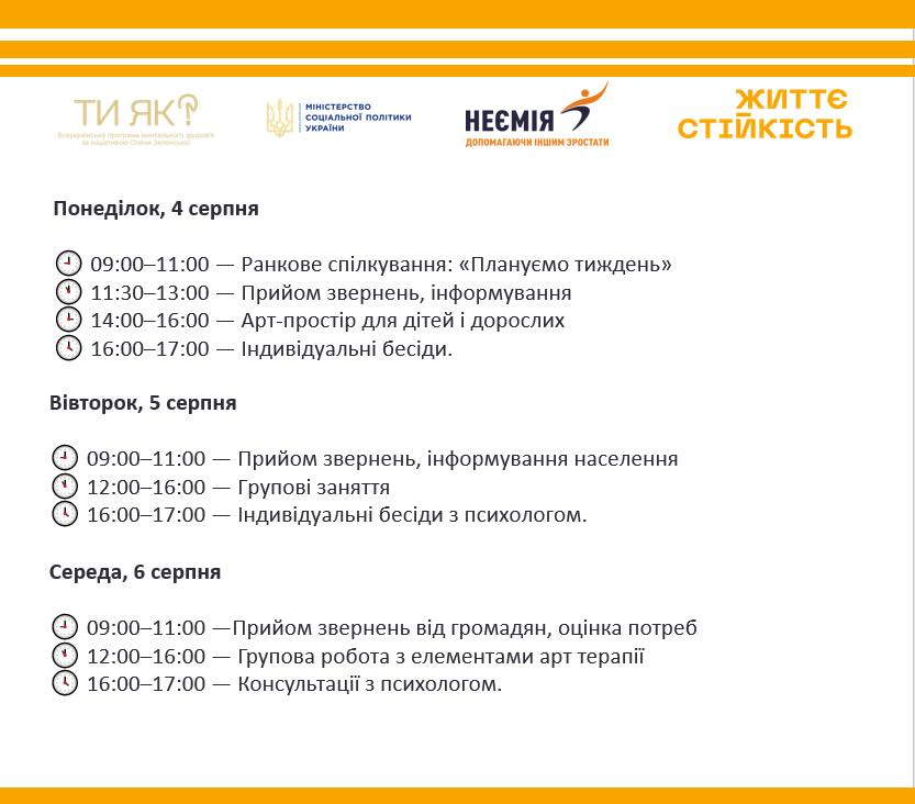 🌿 Початок тижня — це чудова нагода наповнитися енергією, приділити час собі та спланувати майбутні кроки. У Центрі життєстійкості кожен знайде затишок, можливість отримати нові знання та насолодитися теплою атмосферою спілкування. У нас на вас чекають події, що надихають, та практики, спрямовані на відновлення внутрішніх ресурсів. Ми щиро запрошуємо всіх мешканців громади скористатися цим унікальним простором для особистісного розвитку та взаємної підтримки. Цей проєкт реалізується за підтримки Міністерства соціальної політики України та є невід’ємною частиною Всеукраїнської програми ментального здоров’я «Ти як?», започаткованої Першою леді Оленою Зеленською, а також за участі NGO Nehemiah Ukraine.