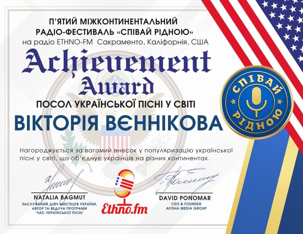 Відзнаку вручили в межах П’ятого Міжконтинентального радіофестивалю «Співай рідною», який проходить у місті Сакраменто (США) на хвилях радіо Ethno FM. Її присуджують за вагомий внесок у збереження української мови та культури через пісенне мистецтво, а також за об’єднання українців у всьому світі.