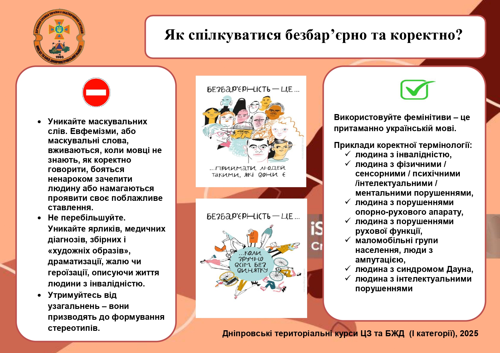 ✅ Говоріть коректно: людина з інвалідністю, людина з порушеннями слуху/зору, людина з синдромом Дауна, маломобільні групи населення тощо.