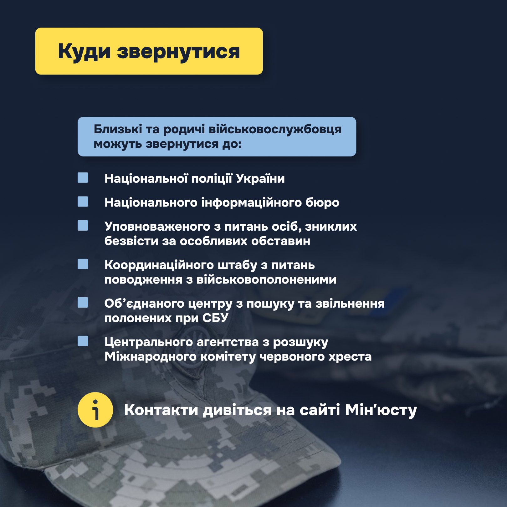У випадку зникнення військовослужбовця або його перебування в полоні, першочерговим кроком є звернення до відповідних державних органів. Важливо якомога швидше подати заяву про зникнення особи до Національної поліції України. Також необхідно повідомити про ситуацію до Територіального центру комплектування та соціальної підтримки (військкомату), де перебував на обліку військовослужбовець. Для офіційного визнання статусу зниклого безвісти або полоненого, родині може знадобитися подати відповідні документи, такі як: