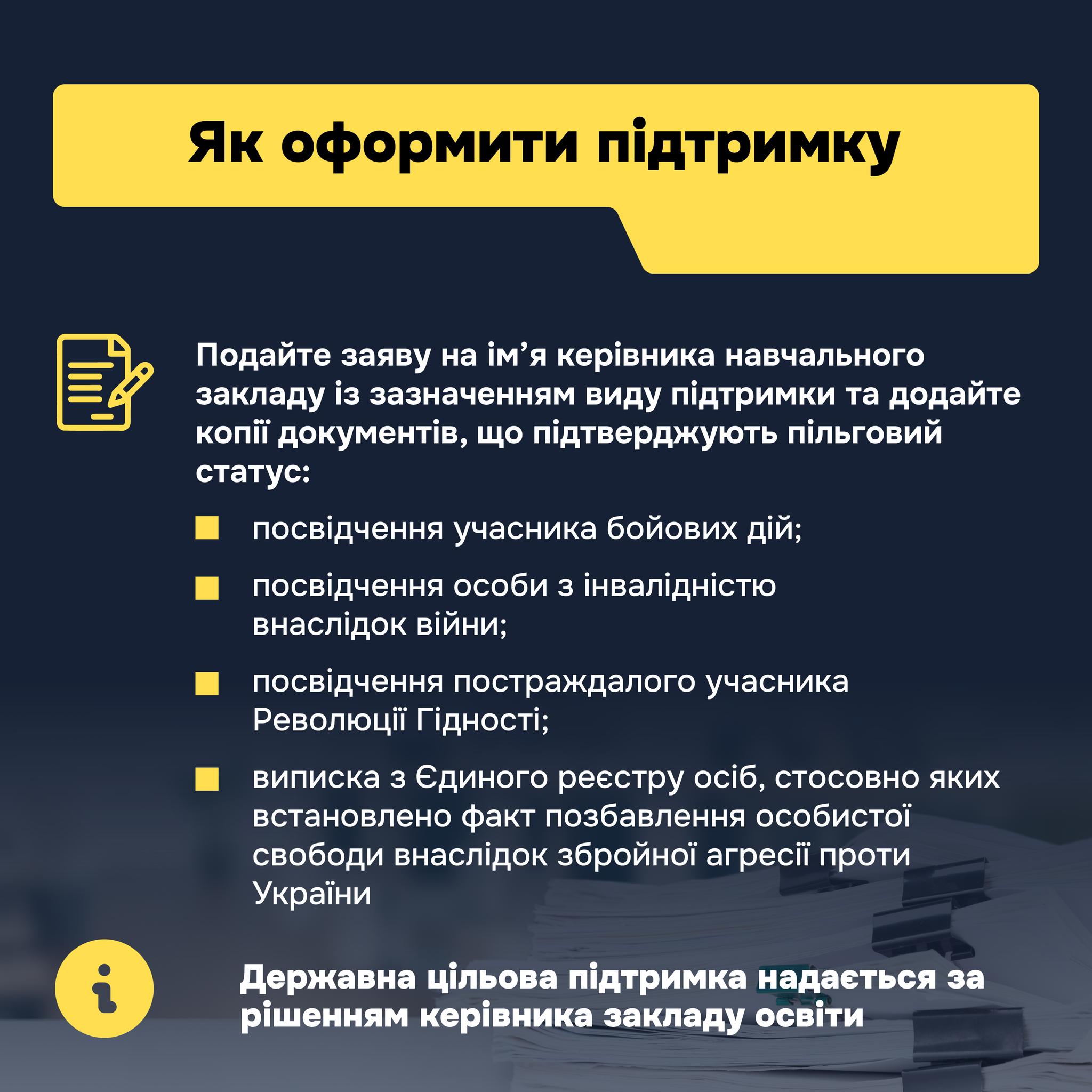 Держава надає цільову підтримку для здобуття професійної, фахової передвищої та вищої освіти — від повної або часткової оплати навчання та соціальної стипендії до безоплатного проживання в гуртожитку та повного доступу до навчальних матеріалів.