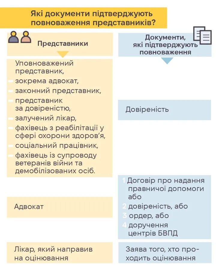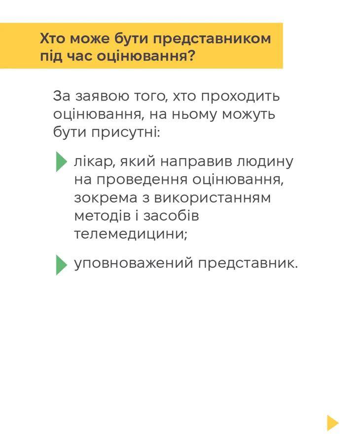 Оновлена процедура оцінювання має суттєві відмінності порівняно з оглядом, який проводили МСЕК. Одне з важливих нововведень — можливість залучити представника, який супроводжуватиме вас під час оцінювання.