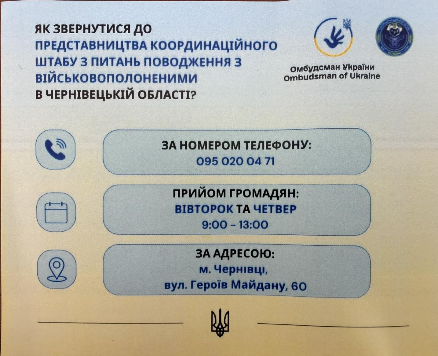 На базі Центру захисту прав людини у Чернівецькій області функціонує представництво — регіональна робоча група Координаційного штабу з питань поводження з військовополоненими.