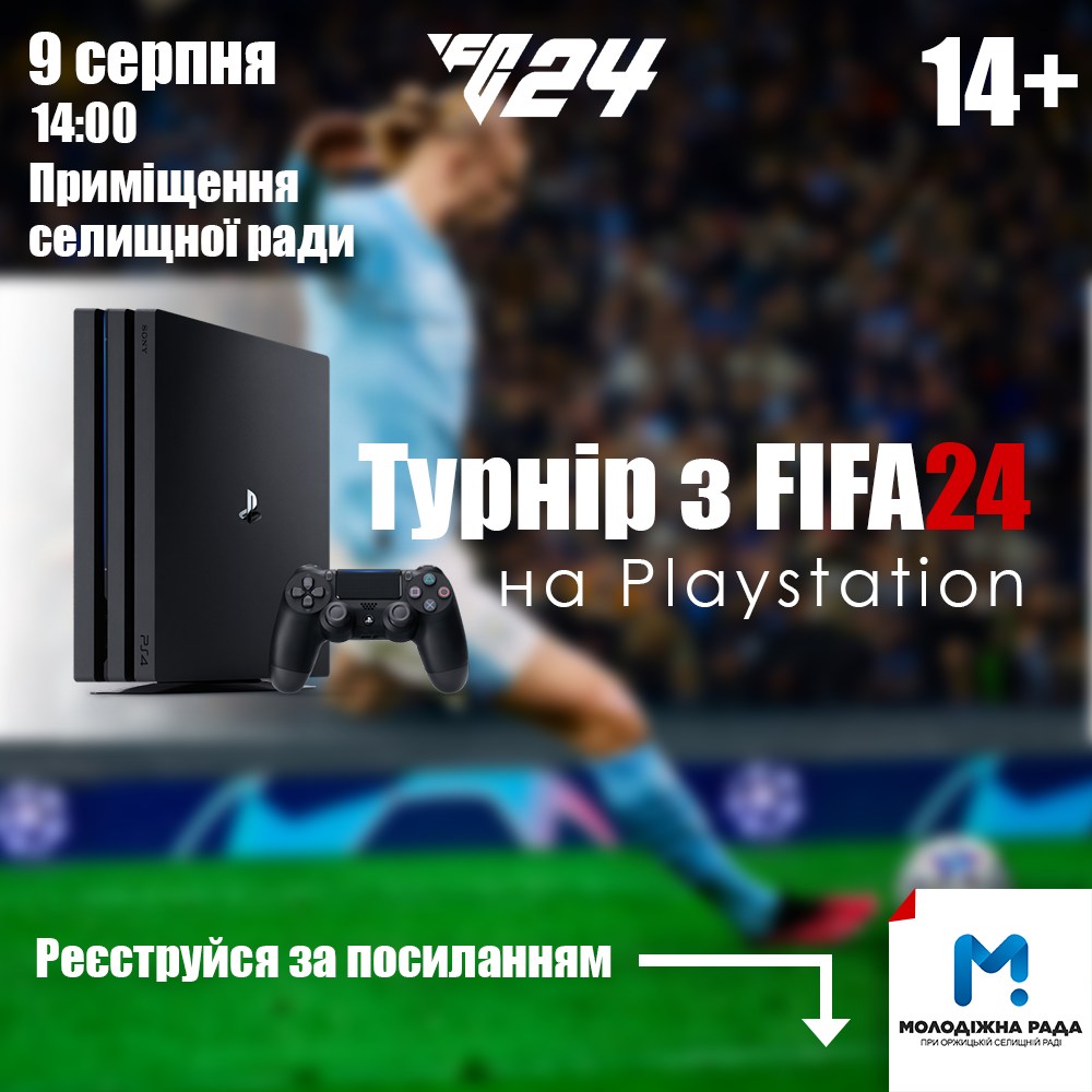 Привіт!👋 До Дня молоді ми організовуємо благодійний турнір із FIFA24 на Playstation для молоді віком від 14 років, який відбудеться у приміщенні селищної ради 9 серпня о 14:00! Тому, якщо маєш бажання випробувати себе у кіберспортивному турнірі, запрошуємо до участі ⚽
