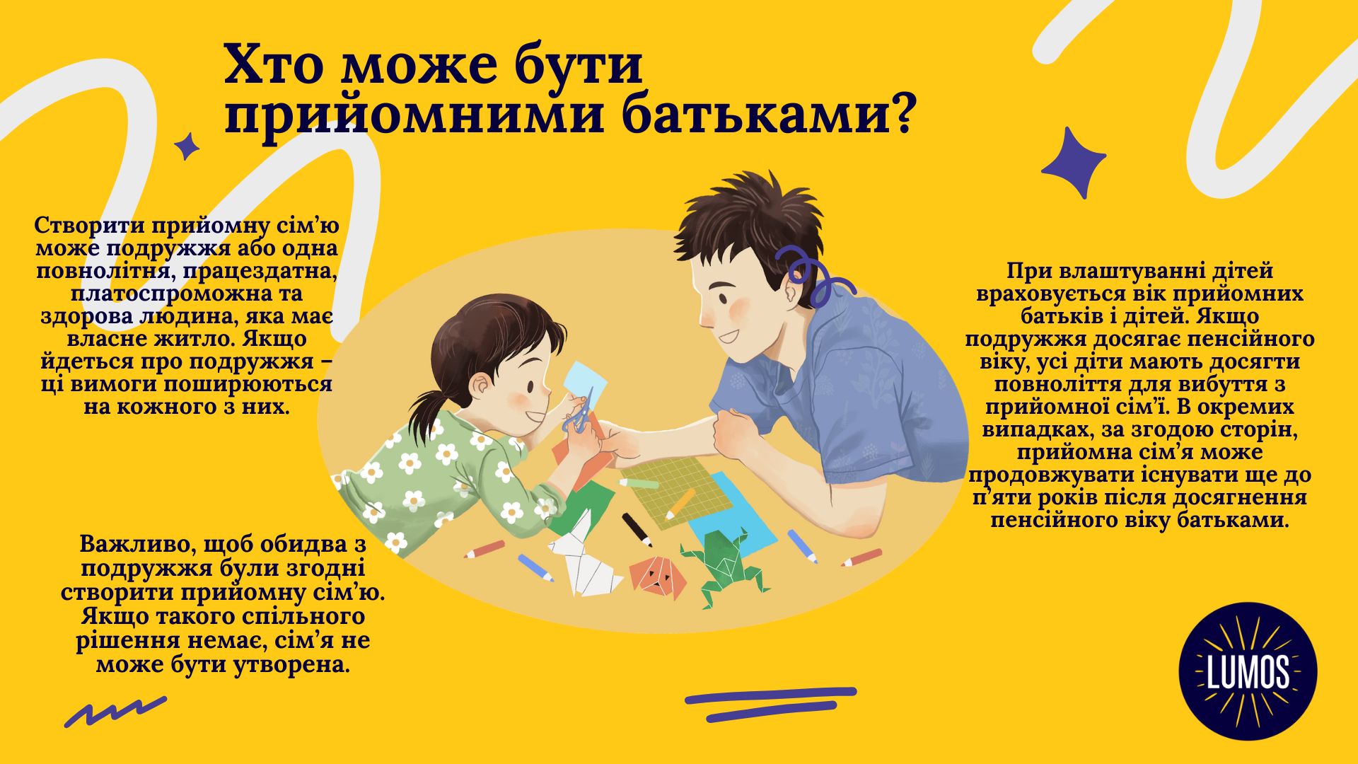 - Хто може стати прийомними батьками: Подружжя або одна самотня, працездатна, платоспроможна людина, яка має власне житло та бажання дарувати любов. Важлива наявність психологічної готовності та здатності забезпечити дитині належні умови для розвитку.