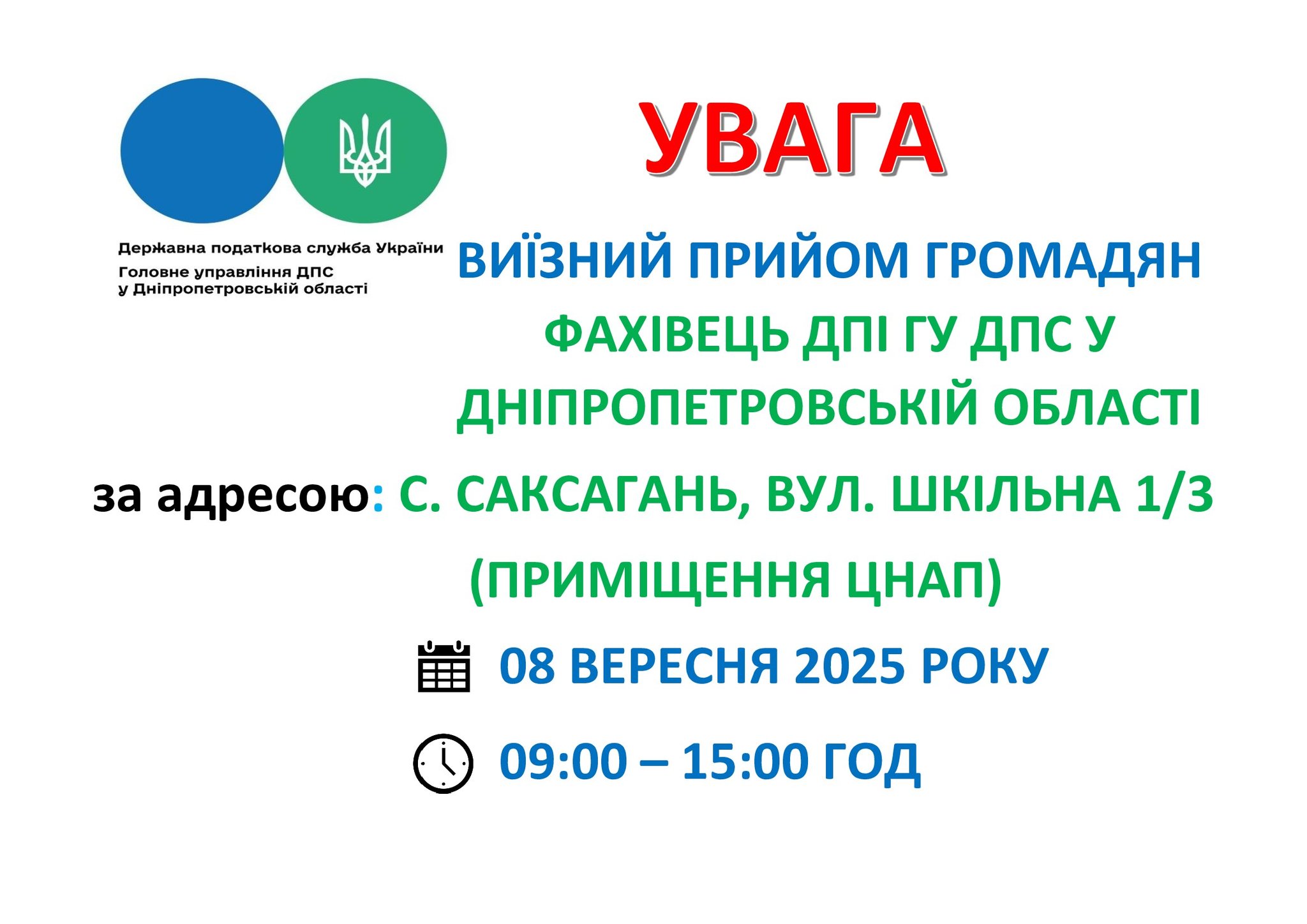 ❗️Зверніть увагу, шановні мешканці громади! Фахівець Державної податкової інспекції Головного управління Державної податкової служби у Дніпропетровській області проводитиме прийом громадян. Це чудова нагода скористатися податковими послугами, не виїжджаючи далеко від дому.