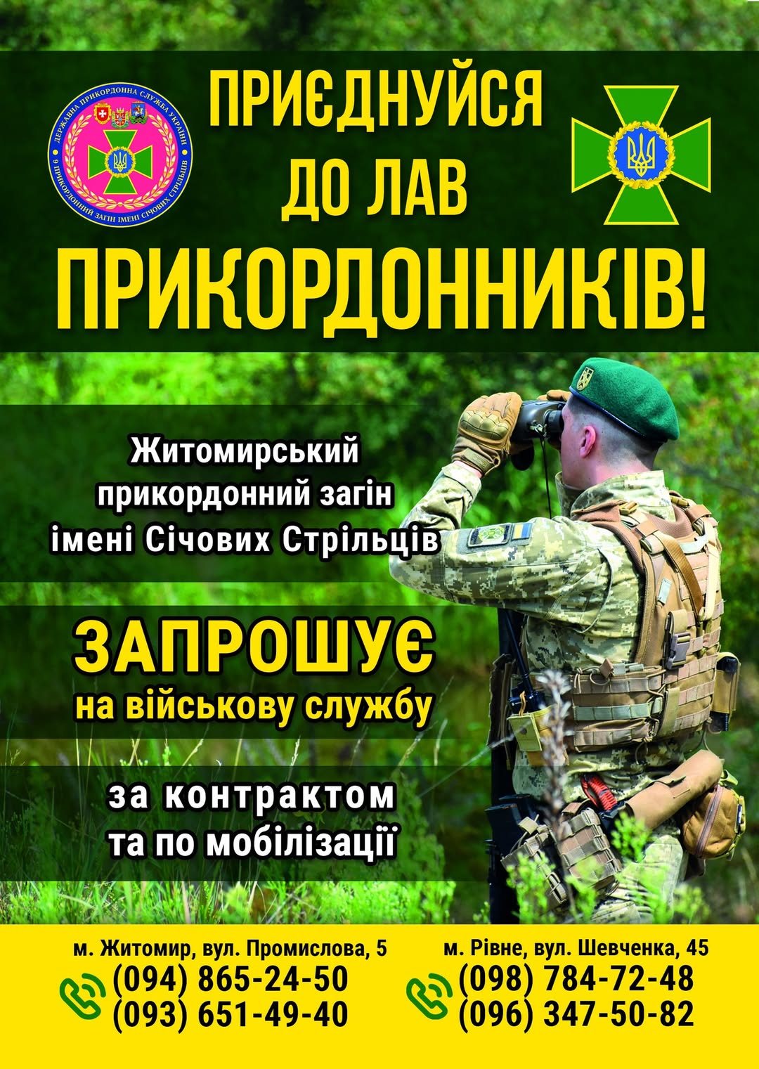 Житомирський прикордонний загін імені Січових Стрільців запрошує на військову службу за контрактом та по мобілізації.