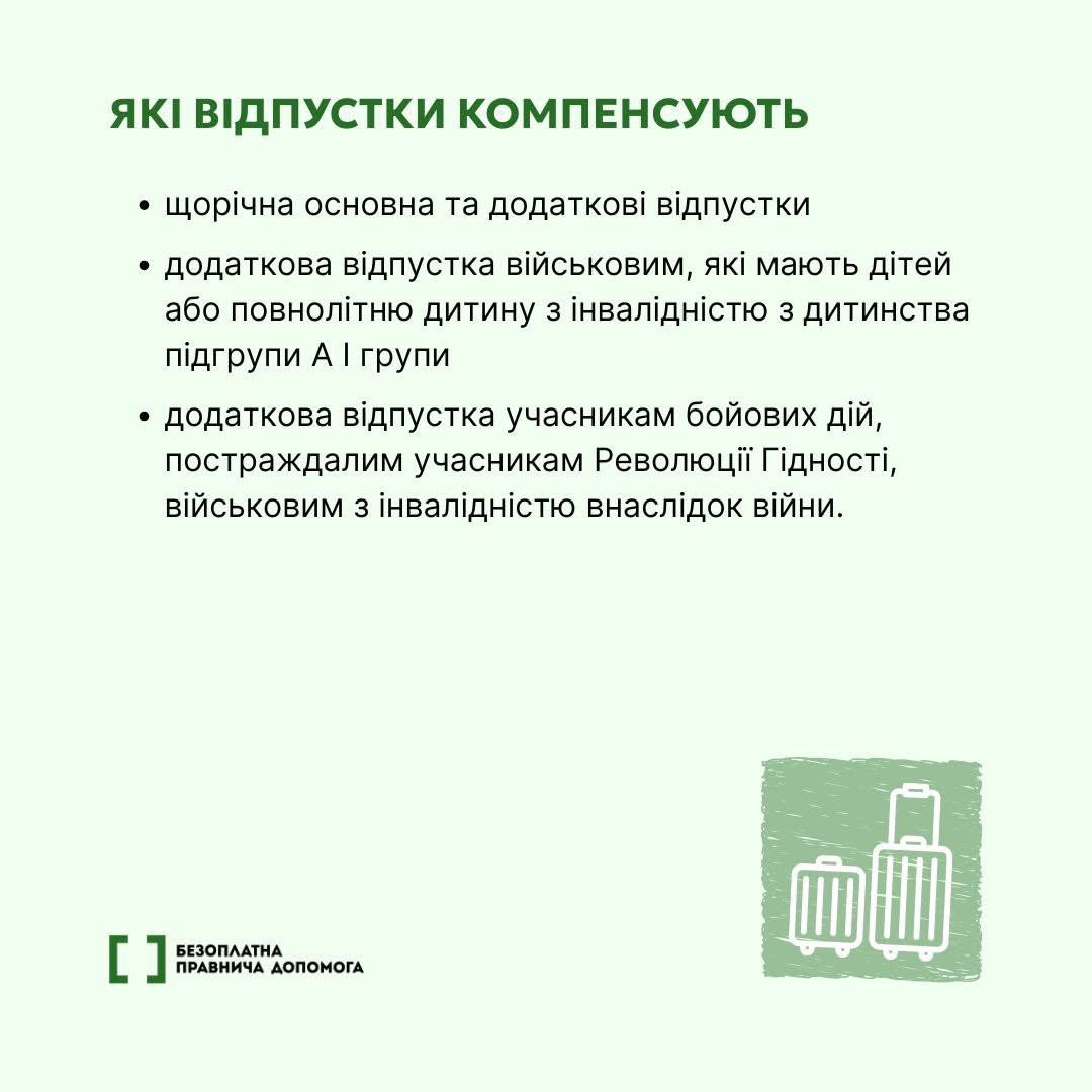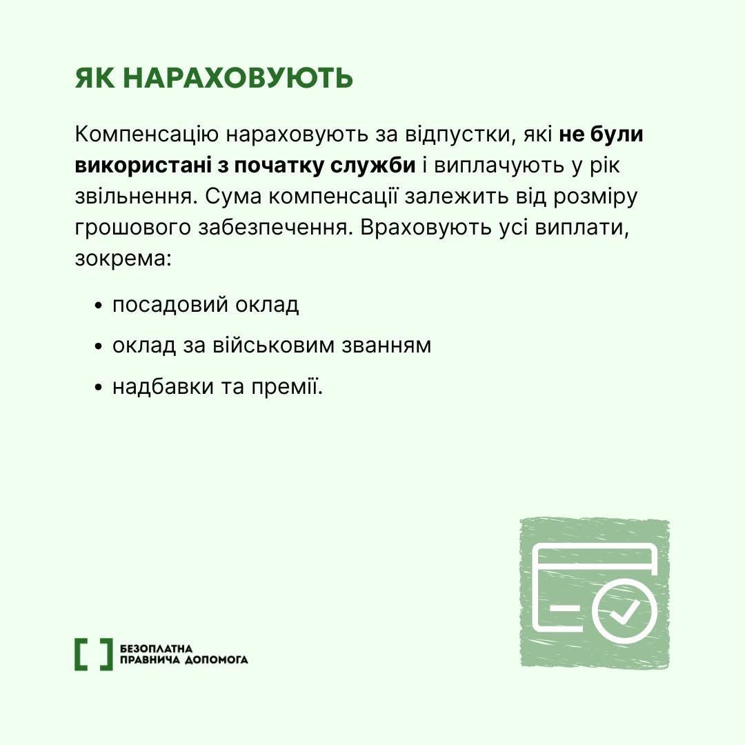 🟩Звільнення з військової служби часто пов’язане з багатьма питаннями, одне з яких — грошова компенсація за невикористану відпустку. Відповідно до статті 10-1 Закону України “Про соціальний і правовий захист військовослужбовців та членів їх сімей”, військовослужбовці, які звільняються зі служби, мають право на отримання такої компенсації. Це означає, що дні щорічної основної відпустки, дні щорічної додаткової відпустки (за наявності), соціальні відпустки (за наявності) та інші дні відпусток, на які військовослужбовець мав право, але не використав їх до дня звільнення, підлягають грошовій виплаті.