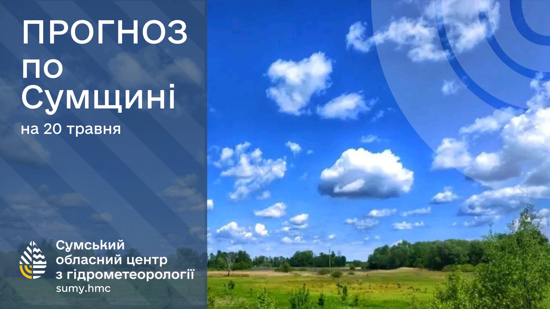 20 травня: Погоду визначатимуть атмосферні фронти циклону з півдня. Очікується хмарна погода, місцями невеликий дощ 🌧️, вночі слабкий туман, вдень місцями гроза⚡. Вітер північно-західний ↘️, 5-10 м/с. Температура повітря по області вночі +6°..+11°, вдень +14°..+19°, по м.Суми вночі +6°..+8°, вдень +16°..+18°.