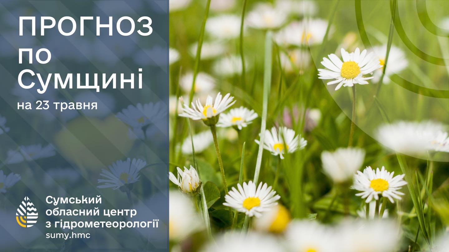 23 травня: Погоду визначатиме поле підвищеного тиску. Очікується мінлива хмарність, без опадів. Вітер південно-східний↖️, 5-10 м/с. Температура повітря по області вночі +10°..+15°, вдень +20°..+25°, по м.Суми вночі +12°..+14°, вдень +23°..+25°.