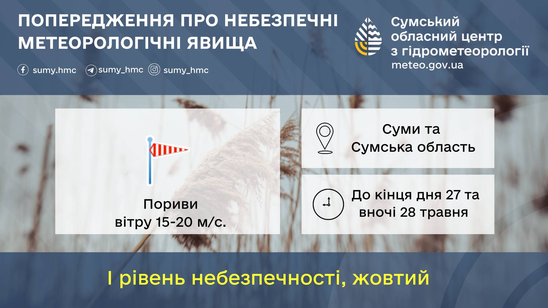 Хмарно з проясненнями, вночі без істотних опадів, вдень невеликий дощ 🌧️. Вітер південно-східний ↖️, 9-14 м/с, місцями пориви 15-20 м/с. Температура повітря по області вночі +14°..+19°, вдень, +20°..+25°, по м.Суми вночі +17°..+19°, вдень, +23°..+28°.
