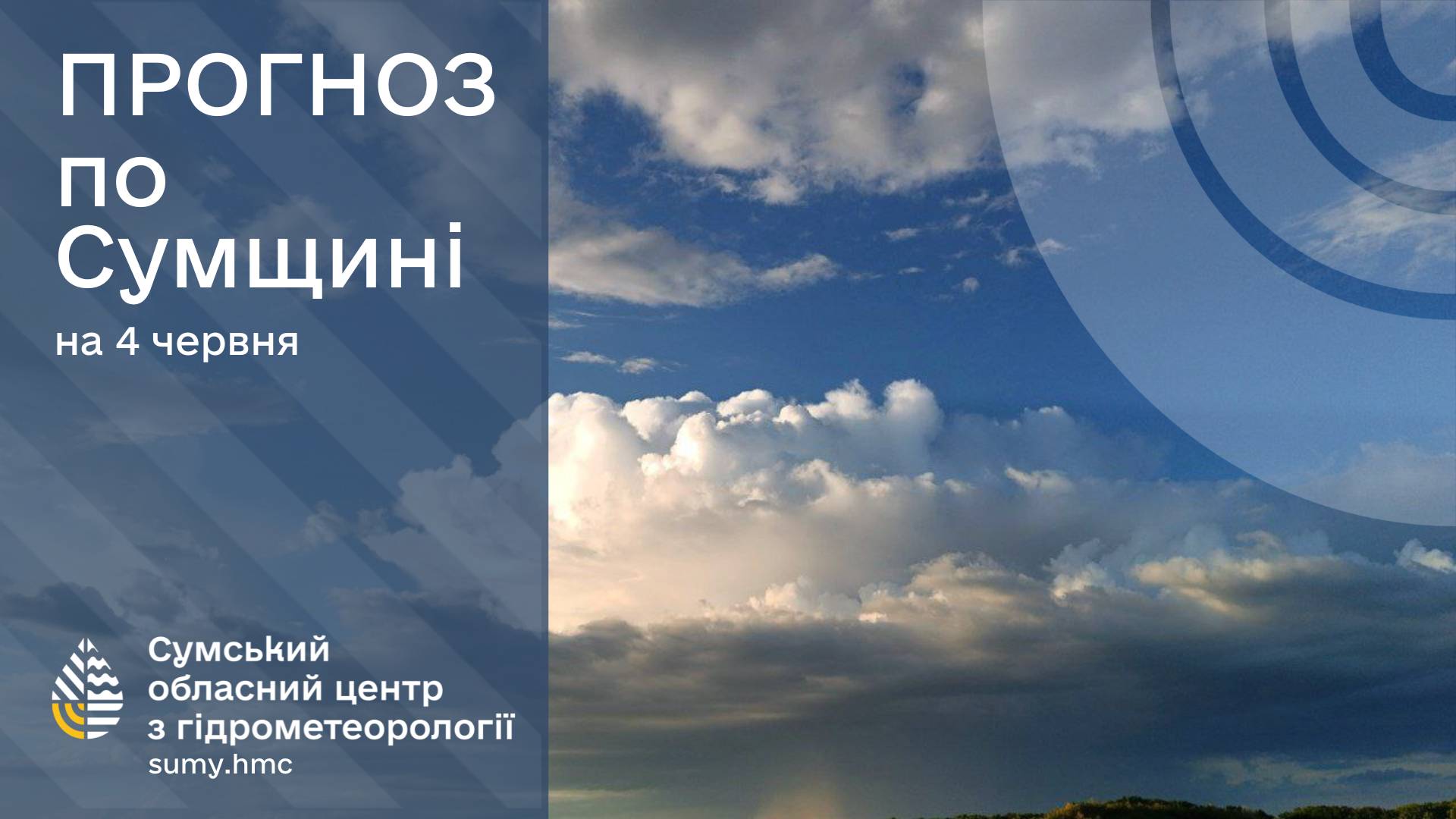 Прогноз погоди в Сумській області на 4 червня передбачає мінливу хмарність, нічні дощі з грозами та помірний вітер. Денна температура повітря коливатиметься в межах +20°..+25° градусів. Не забудьте взяти парасольку, якщо плануєте бути на вулиці вночі.
