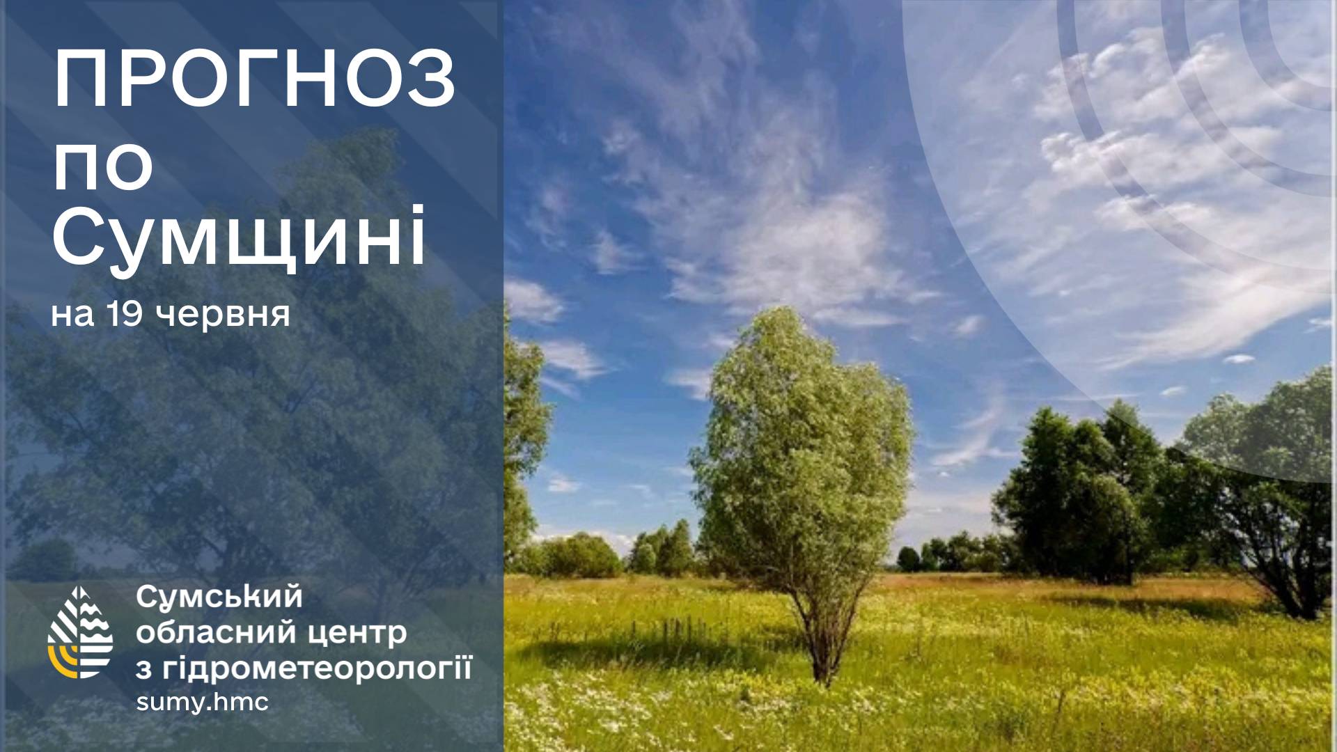 19 червня: Погода визначатиметься тиловою частиною циклону з півночі. Очікується мінлива хмарність, невеликий короткочасний дощ 🌧️, вдень місцями гроза ⚡. Вітер північно-західний ↘️, 7-12 м/с, вдень місцями пориви 15-20 м/с. Температура повітря по області вночі +12°..+17°, вдень +19°..+24°, по м.Суми вночі +13°..+15°, вдень +21°..+23°.