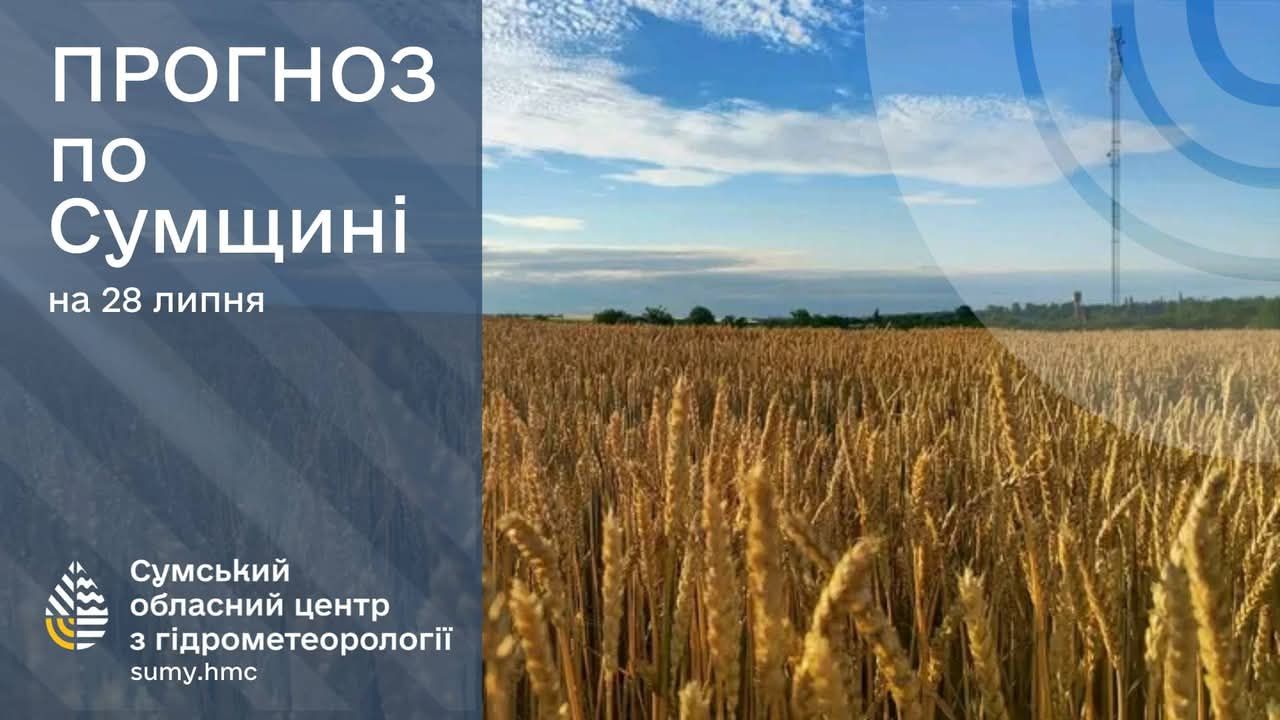 Прогноз погоди для Сумської області на 28 липня: Очікується переважно сонячна погода завдяки впливу антициклону. Впродовж дня буде мінлива хмарність, але опадів не передбачається. Вітер східний, 5-10 м/с. Температура повітря в області вночі коливатиметься від +18° до +23°, а вдень стовпчик термометра підніметься до +27°..+32°. У місті Суми вночі температура становитиме +19°..+21°, а вдень +30°..+32°.