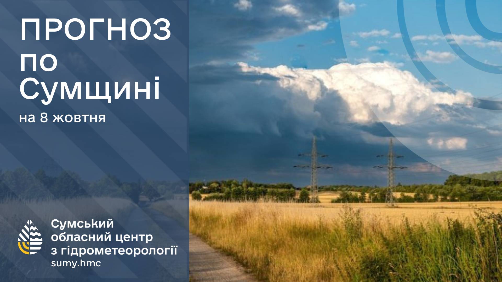 Погоду на Сумщині 8 жовтня визначатиме теплий сектор циклону, що насувається з півдня. Очікується хмарна погода, вночі без значних опадів, але вдень місцями можливий невеликий дощ. Вітер буде північно-східним зі швидкістю 7-12 м/с. Температурні показники по області вночі коливатимуться від +7° до +12°, а вдень від +12° до +17°. У місті Суми вночі прогнозують від +9° до +11°, а вдень повітря прогріється до +15°..+17°.
