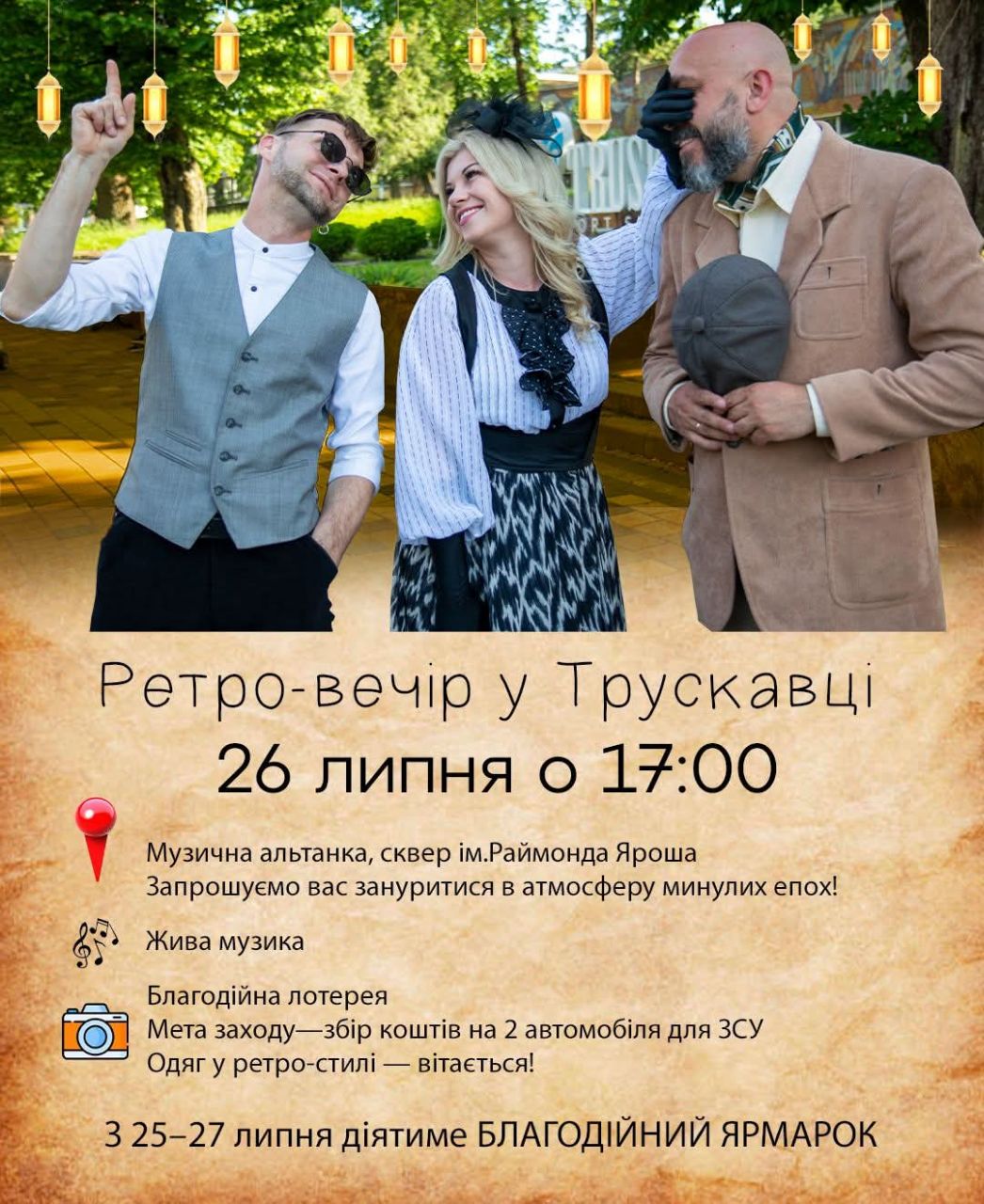 * **17:00:** Ретро-вечір біля музичної альтанки. Це благодійний захід, спрямований на збір коштів для Збройних Сил України. Долучіться до доброї справи!