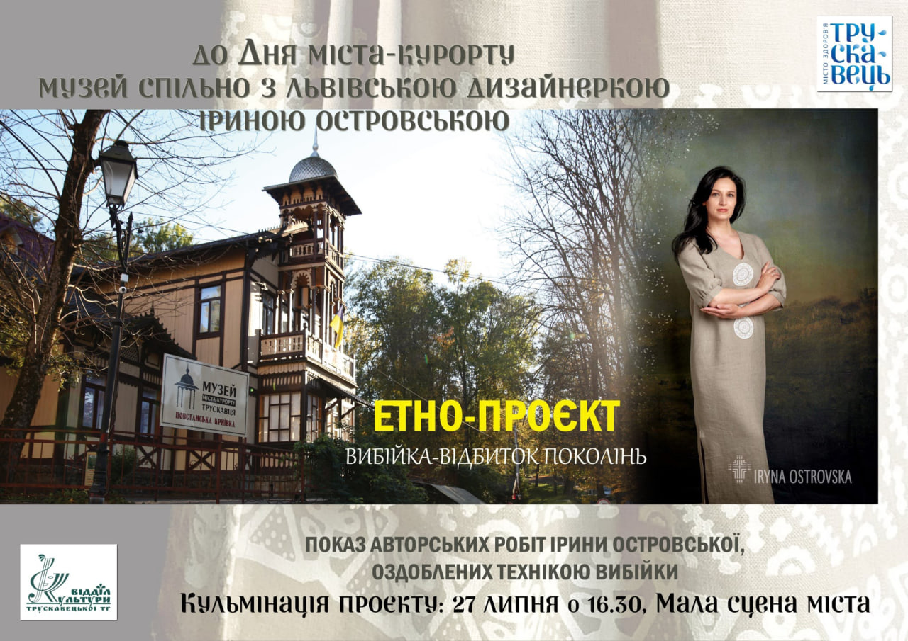 * **16:30:** Унікальний етно-проєкт музею міста-курорту та дизайнерки Ірини Островської «Вибійка – відбиток поколінь» на малій сцені. Презентація авторських виробів львівської дизайнерки.