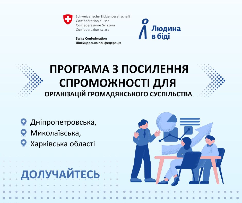 30 організацій громадянського суспільства отримають унікальну можливість посилити свою спроможність завдяки ініціативі «Людина в біді» / People in Need Ukraine, що реалізується за підтримки Уряду Швейцарії. Ця програма спрямована на розвиток та зміцнення потенціалу ОГС, які працюють у постраждалих від війни регіонах.