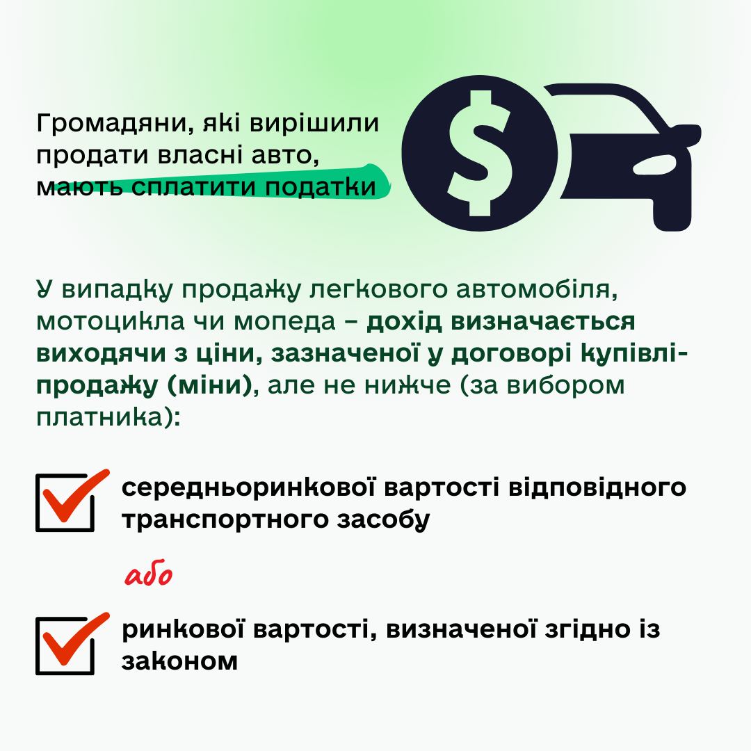 У разі продажу легкового автомобіля, мотоцикла або мопеда, дохід визначається на основі ціни, зазначеної в договорі купівлі-продажу (міни). Однак, ця сума не може бути нижчою за середньоринкову вартість транспортного засобу або його ринкову вартість, визначену відповідно до чинного законодавства, за вибором платника податків.