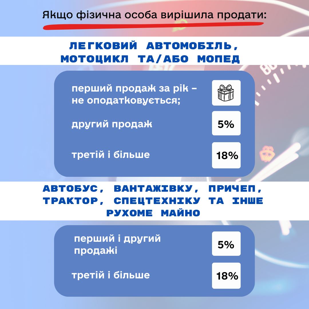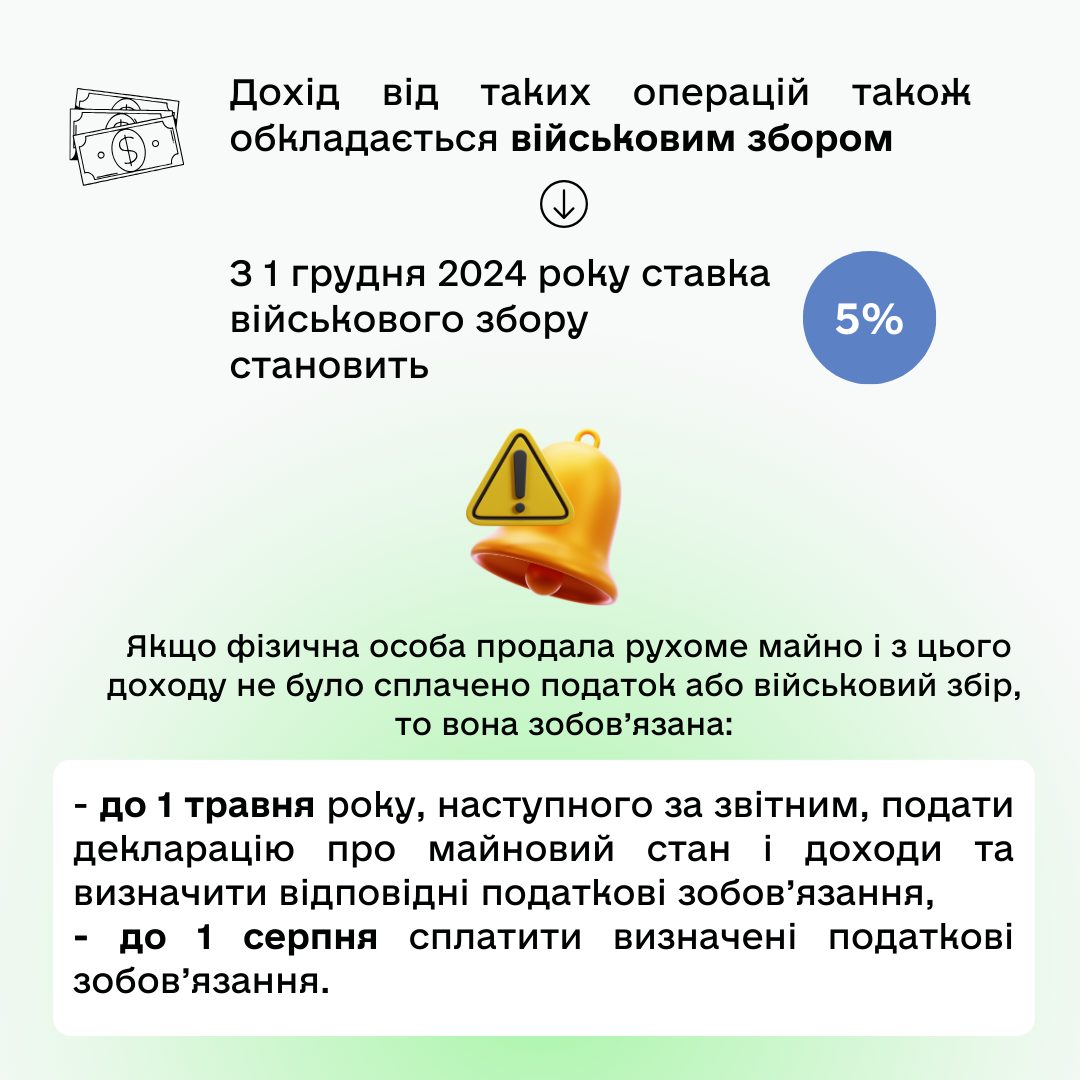 Важливо пам’ятати, що дохід від усіх вищезазначених операцій з продажу рухомого майна також підлягає оподаткуванню військовим збором. З 1 грудня 2024 року ставка військового збору становить 5 %.