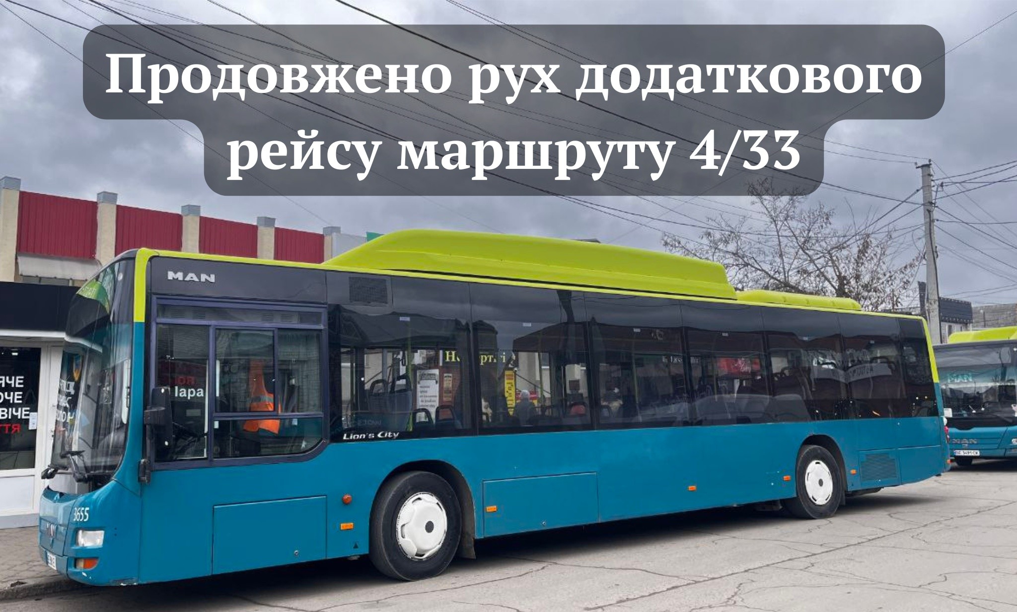 ✅ Чудові новини для мешканців! Рух додаткового ранкового рейсу автобуса №4/33 було продовжено. Ця важлива транспортна артерія тепер буде доступна для вас у будні дні, з понеділка по п’ятницю, забезпечуючи зручне пересування містом.