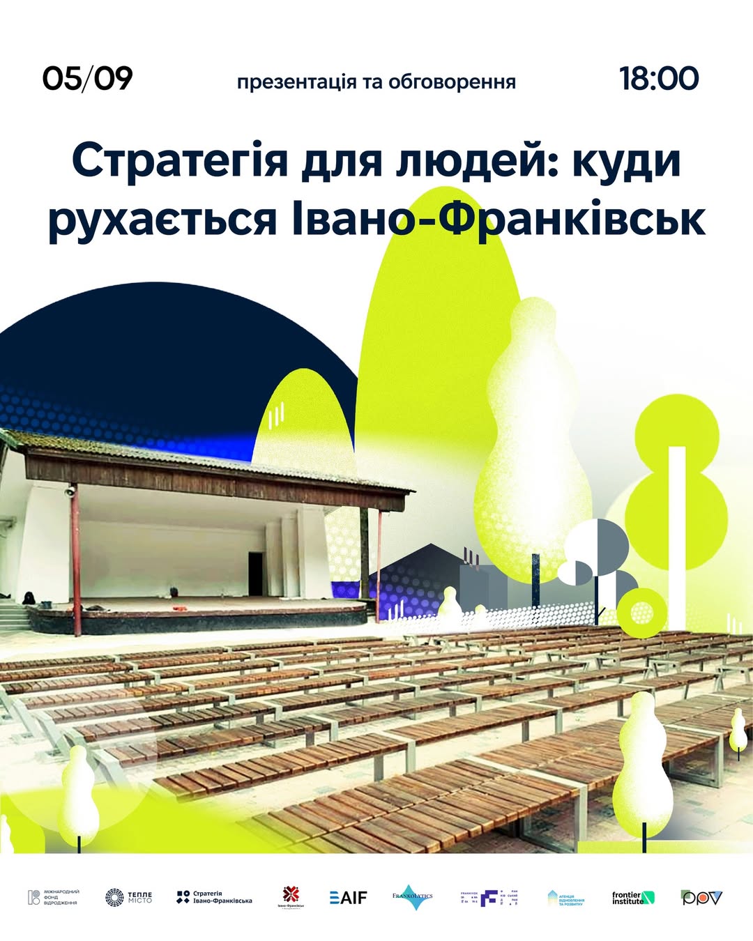 📍 Де: літня сцена міського парку ім. Тараса Шевченка. Зручне місце для зустрічі та обговорення важливих питань, що стосуються майбутнього Івано-Франківська. Ми прагнемо створити простір, де кожен зможе висловити свою думку.