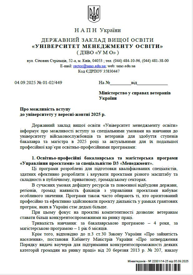 Державний заклад вищої освіти «Університет менеджменту освіти» відкриває двері для військовослужбовців та ветеранів, надаючи унікальну можливість отримати вищу освіту за спеціальними умовами. Вступ до університету можливий у вересні-жовтні 2025 року для здобуття освітніх ступенів бакалавра та магістра. Ця ініціатива спрямована на підтримку тих, хто захищав нашу країну, та надання їм нових професійних перспектив після завершення служби. Ми пропонуємо актуальні освітньо-професійні програми, які відповідають сучасним вимогам ринку праці та сприятимуть успішній подальшій кар’єрі. Вступ до університету менеджменту освіти для військових – це шанс на здобуття нових знань та навичок, що допоможуть у мирному житті. Ця програма вступ до університету для ветеранів та військовослужбовців враховує їхній досвід та специфічні потреби. Ми прагнемо створити сприятливі умови для адаптації та розвитку наших захисників у цивільному житті через якісну освіту. Освітні програми розроблені з урахуванням актуальних тенденцій і потреб економіки, що забезпечить здобуття затребуваних спеціальностей. Ми віримо, що кожен військовослужбовець та ветеран заслуговує на шанс отримати якісну вищу освіту. Саме тому університет менеджменту освіти пропонує спеціальні умови вступу. Це чудова нагода для тих, хто прагне до саморозвитку та професійного зростання. Детальніше про умови вступу до університету за спеціальними програмами для військових та ветеранів у 2025 році можна дізнатися з офіційних джерел університету. Ми заохочуємо всіх, хто відповідає критеріям, скористатися цією можливістю. Навчання за освітньо-професійними програмами бакалаврату та магістратури відкриє нові горизонти. Вступ до університету для військовослужбовців у 2025 році – це інвестиція у ваше майбутнє. Не пропустіть цей шанс отримати бажану освіту та розвинути свій потенціал.