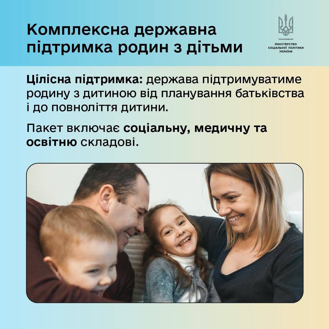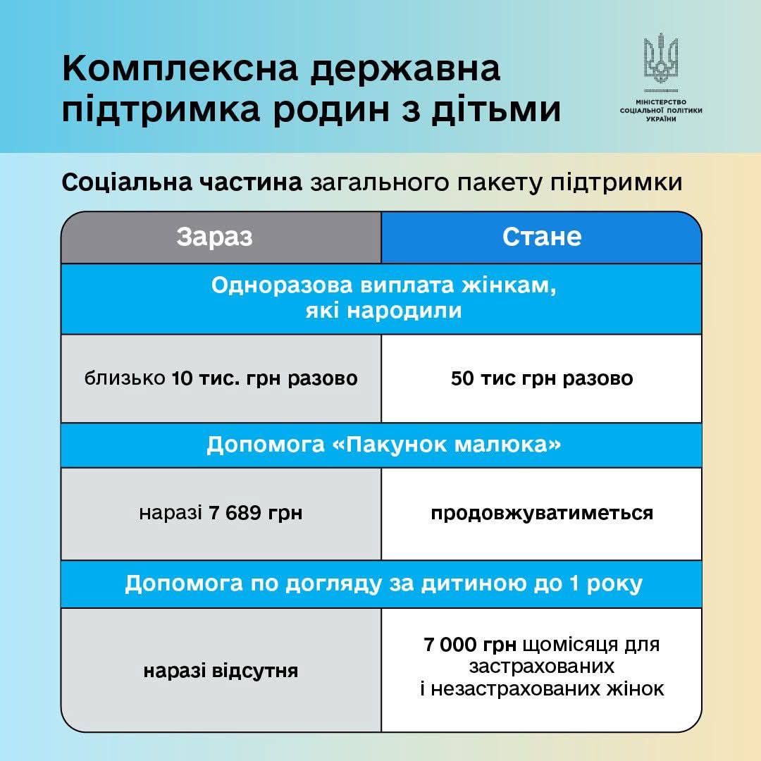 Звертаємо увагу, що це — тільки соціальна частина загального пакету підтримки. Загалом він буде передбачати комплексну медичну підтримку (від моменту планування народження до дорослішання дитини), а також всебічну підтримку на етапі освіти.