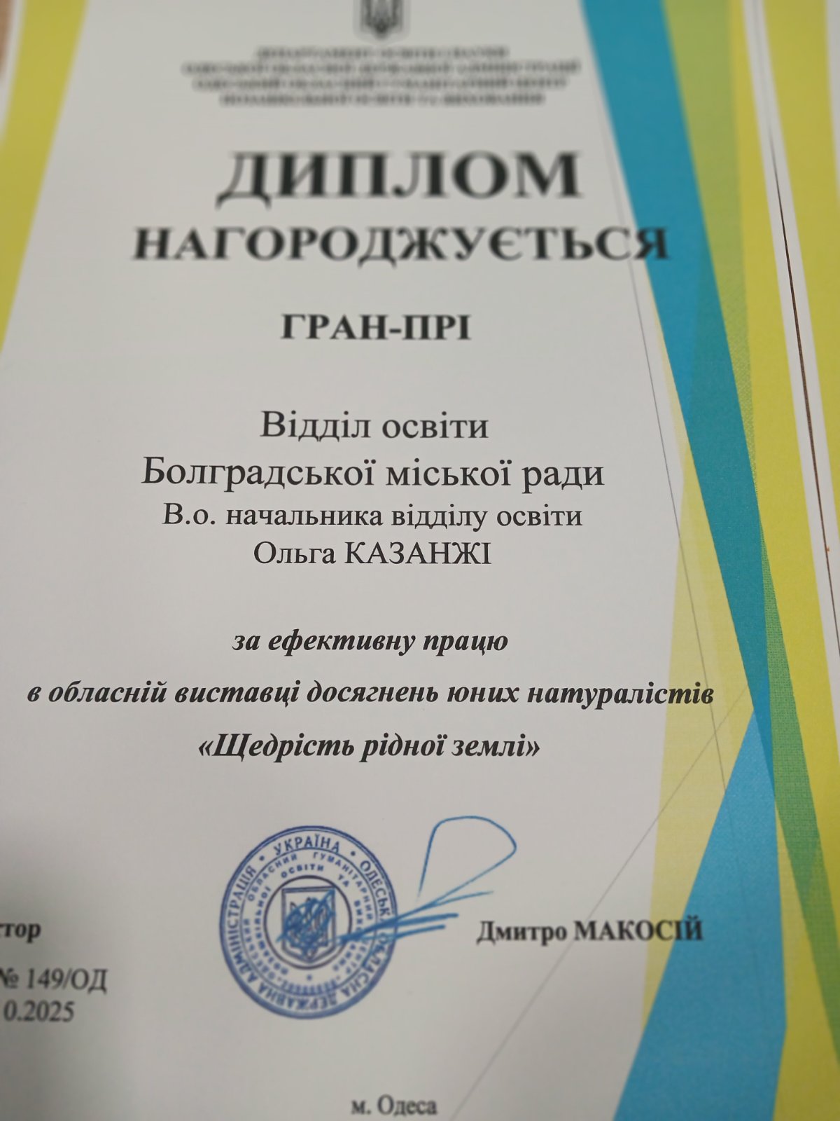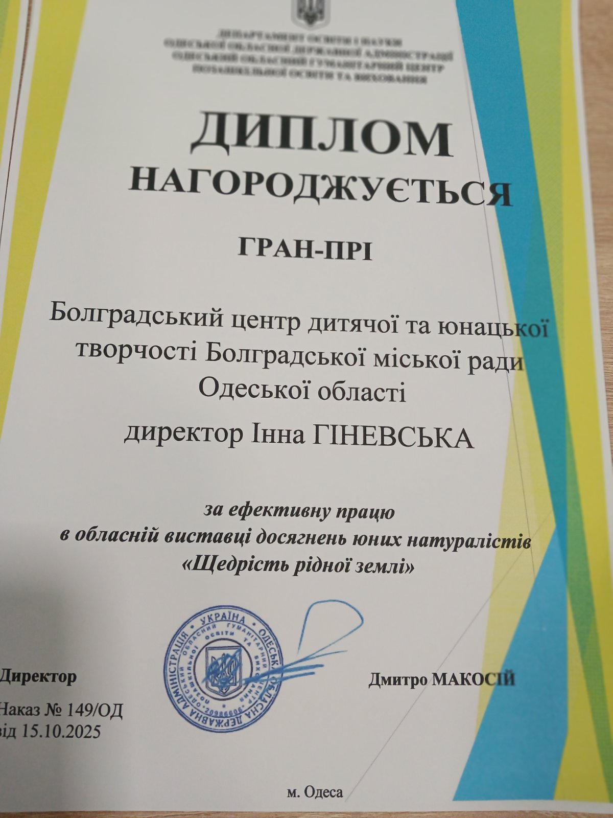 Згідно з наказом Одеського обласного гуманітарного центру позашкільної освіти та виховання від 15.10. 2025 р. №149/ОД «Про підсумки обласної виставки досягнень юних натуралістів «Щедрість рідної землі»», нагороджуються **дипломами Гран-прі** за перемогу Відділ освіти Болградської міської ради (в.о. начальника відділу освіти Ольга КАЗАНЖІ) та БОЛГРАДСЬКИЙ ЦДЮТ (директор Інна ГІНЕВСЬКА).