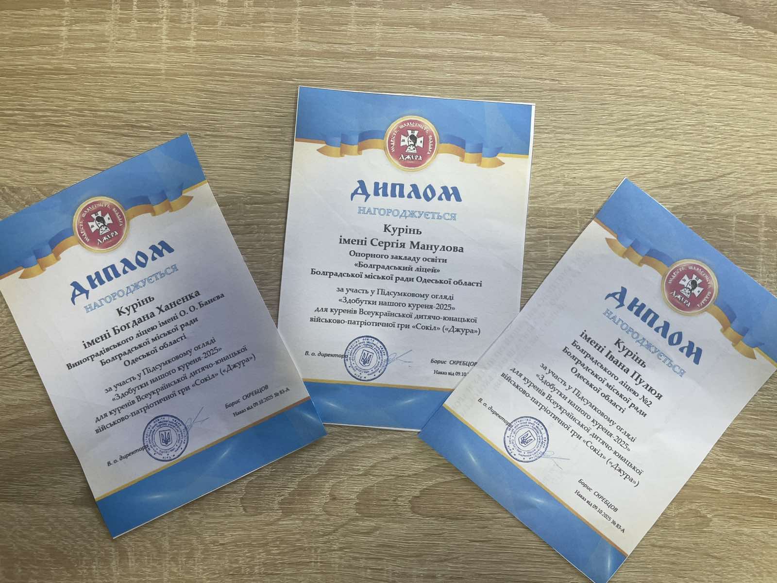 За результатами ретельного оцінювання та підрахунку балів, декілька навчальних закладів продемонстрували видатні досягнення. Зокрема, курені гри «Джура» з Болградського ліцею №2, Виноградівського ліцею та ОЗ “Болградський ліцей” були високо відзначені. Ці навчальні заклади отримали почесні дипломи від Українського державного центру національно-патріотичного виховання, краєзнавства і туризму учнівської молоді, що є свідченням їхньої сумлінної праці та ефективності у патріотичному вихованні.
