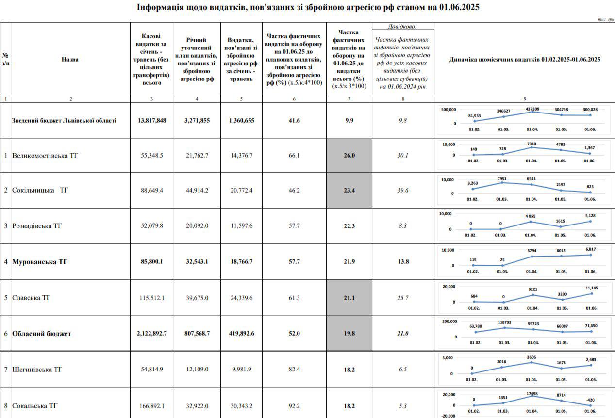 💪🏼Найбільшу частку видатків, пов’язаних зі збройною агресією рф, у загальному обсязі видатків без цільових трансфертів показали Великомостівська (26%), Сокільницька (23,4%), Розвадівська (22,3%), Мурованська (21,9%), Славська (21,1%) громади, а також обласний бюджет (19,8%). Ці громади демонструють високий рівень відповідальності та відданості справі підтримки армії.