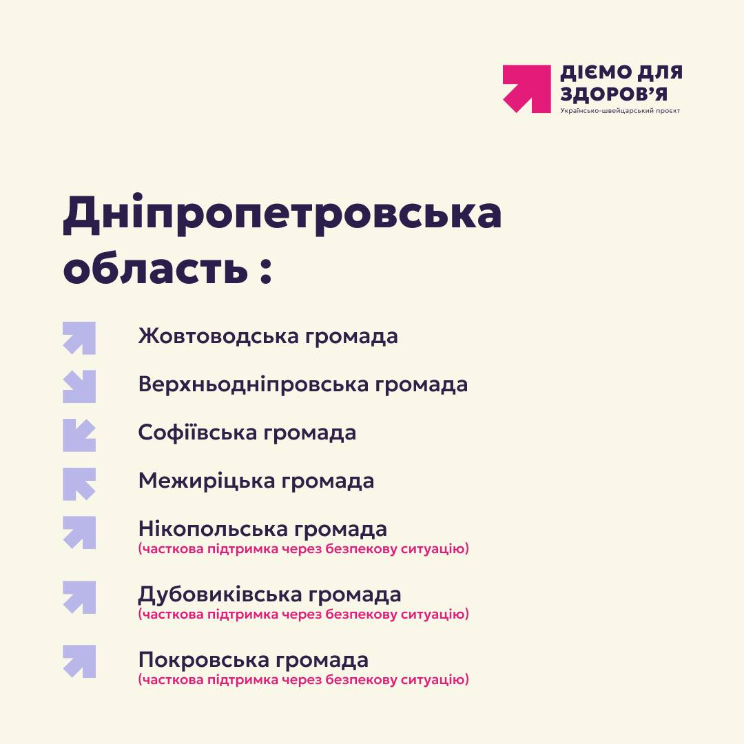 Надзвичайно раді повідомити важливу новину: визначено перелік громад, які долучаються до Українсько-швейцарського проєкту “Діємо для здоров’я”! Упродовж наступних чотирьох років ці громади стануть епіцентром трансформаційних змін у сфері охорони здоров’я, впроваджуючи передові ініціативи, спрямовані на значне покращення добробуту своїх мешканців. Це масштабна подія, що відкриває нові можливості для зміцнення здоров’я на місцевому рівні та сприяє сталому розвитку громад. Проєкт “Діємо для здоров’я” є ключовим у формуванні здорового суспільства.Загалом 31 громада з Черкаської, Дніпропетровської, Херсонської, Полтавської, Хмельницької, Рівненської та Львівської областей отримають підтримку від проєкту “Діємо для здоров’я”. Їхня участь є свідченням високої зацікавленості та готовності до впровадження інноваційних підходів у сфері громадського здоров’я. Серед ключових програм, які будуть реалізовані, варто відзначити такі, як «Здорова громада», що передбачає комплексний підхід до зміцнення здоров’я всіх жителів; «Здорова школа», спрямована на формування здорових звичок серед учнів та педагогів; «Всетурбота», яка забезпечує всебічну підтримку вразливих груп населення; «Здорові бібліотеки», що перетворять бібліотеки на центри просвіти та інформації про здоров’я; а також «Передові центри підтримки людей з НІЗ», що забезпечать якісну допомогу особам із неінфекційними захворюваннями. Ці соціальні ініціативи мають на меті не лише лікування, а й профілактику та заохочення здорового способу життя, що є фундаментом для міцного здоров’я громад.Вибір пілотних громад відбувався на конкурсній основі, і конкуренція була надзвичайно високою, що лише підтверджує значний потенціал України у розбудові культури турботи про здоров’я. Кожна громада, яка подала заявку, продемонструвала свою відданість ідеям покращення благополуччя своїх мешканців. Ми глибоко вдячні всім учасникам за їхню активність та бажання долучитися до цієї важливої місії. Завдяки швейцарській підтримці, цей проєкт стане каталізатором позитивних змін у сфері охорони здоров’я та сприятиме сталому розвитку громад, а відтак і покращенню загального здоров’я громад по всій країні.Попереду на пілотні громади чекає важлива та плідна спільна робота. Ми сповнені оптимізму щодо результатів, адже програми здоров’я, що будуть впроваджені, матимуть довготривалий вплив на якість життя українців. Ця ініціатива є яскравим прикладом того, як міжнародна співпраця може прискорити прогрес у таких критично важливих сферах, як охорона здоров’я та розвиток громад. Ми вітаємо всі відібрані громади та з нетерпінням очікуємо початку цієї спільної подорожі, яка розпочнеться вже зовсім скоро. Зміцнення здоров’я громад – це наш спільний пріоритет, що вимагає постійних зусиль та інвестицій у майбутнє. Це шлях до сильних і процвітаючих громад.
