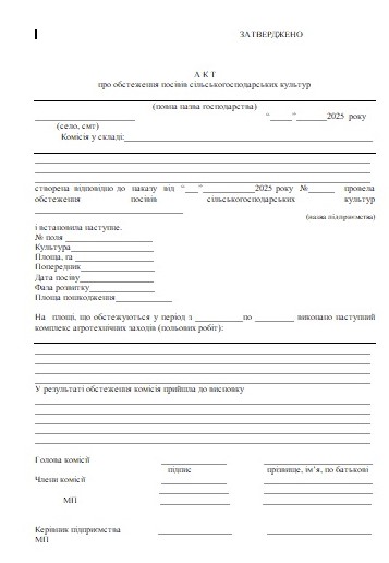 Завдання комісії – зафіксувати факт загибелі (пошкодження) посівів, оцінити розмір завданої шкоди, внести пропозиції щодо подальших дій: чи продовжувати вирощування, чи пересівати, чи списувати посіви. Результати роботи комісії оформлюються актом обстеження (довільної форми) у двох примірниках, який підписують голова та всі члени комісії. Акт затверджується керівником підприємства. До акту рекомендується додати фотографії пошкоджених полів.