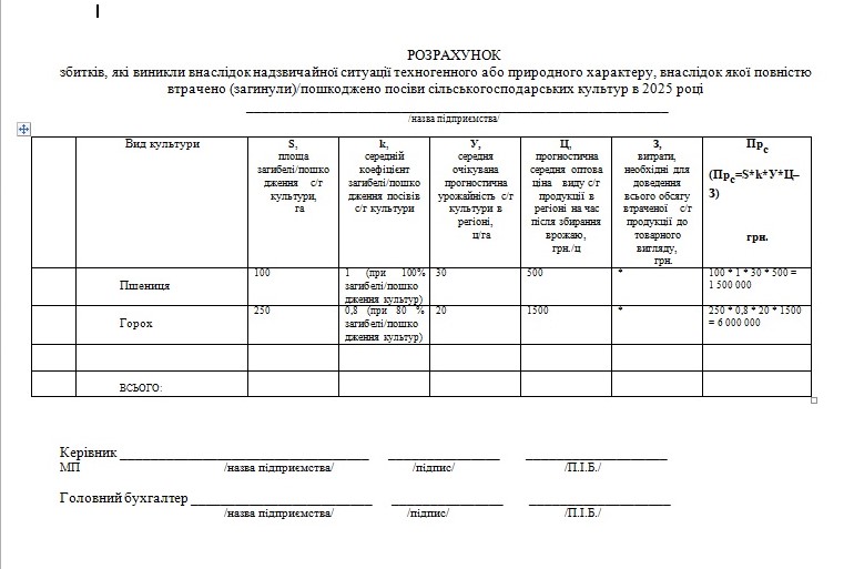 Розрахунок збитків від втрат незібраної сільськогосподарської продукції здійснюється відповідно до постанови Кабінету Міністрів України № 175 від 15 лютого 2002 року «Про затвердження Методики оцінки збитків від наслідків надзвичайних ситуацій техногенного і природного характеру». Розрахунок базується на середній врожайності культур у відповідному регіоні та прогнозованих оптових цінах.